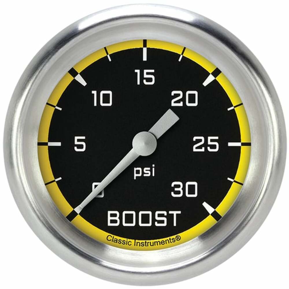 AutoCross Yellow 2 5/8" Full sweep Boost gauge, 30psi, with aluminum performance bezel and flat glass lens.