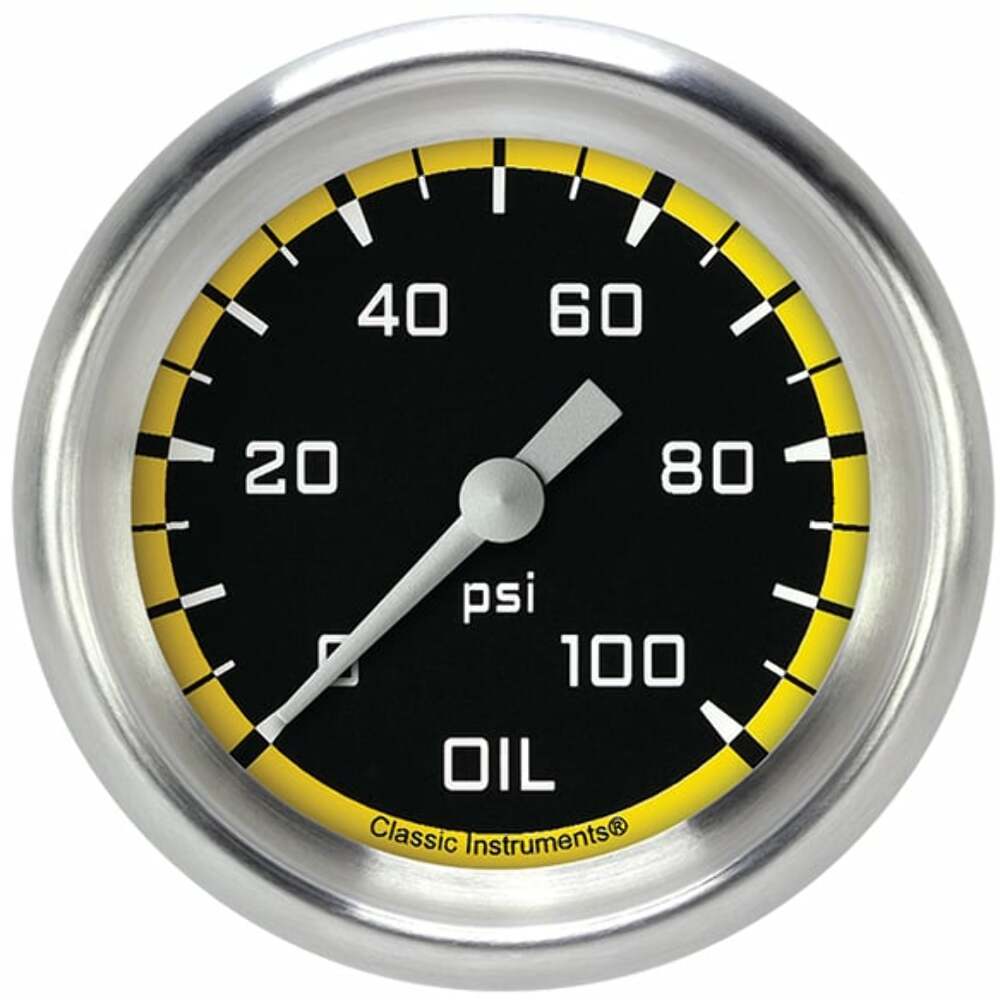 AutoCross Yellow 2 5/8" Full sweep Oil Pressure gauge, 100psi, with aluminum performance bezel and flat glass lens.