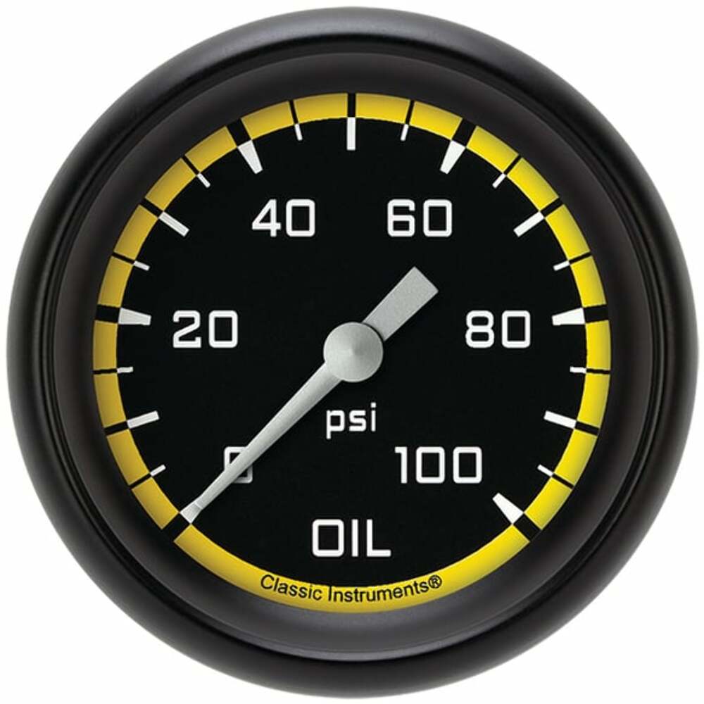 AutoCross Yellow 2 5/8" Full sweep Oil Pressure gauge, 100psi, with matte-black performance bezel and flat glass lens.