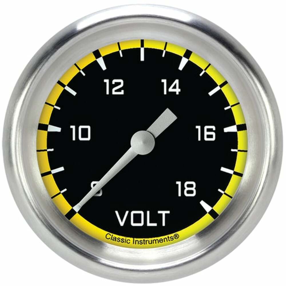 AutoCross Yellow 2 5/8" Full sweep voltage gauge with aluminum performance bezel and flat glass lens.