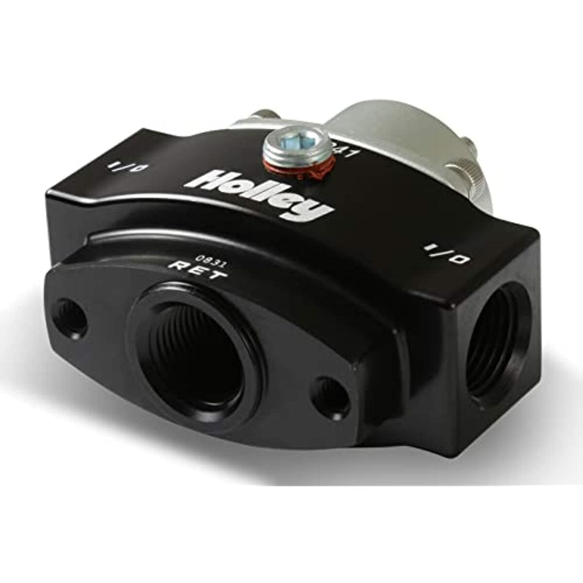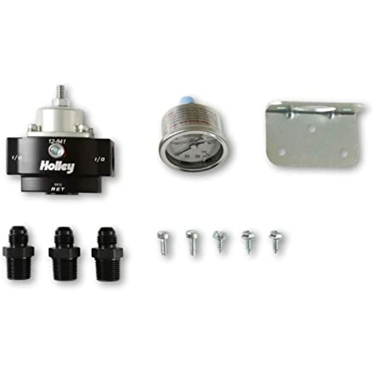 Holley Billet Bypass Style Fuel Pressure Regulator Kits are part of a complete line of fuel system products from Holley. The included 12-841 regulator features a billet aluminum body and a black finish for corrosion resistance and good looks. The regulator contains 3/8" NPT in/out ports, a 3/8" NPT return port, a 1/8" NPT gauge port. In addition, 3 adapter fittings, a barbed fitting for the vacuum port, a mounting bracket, and all necessary hardware are also included.