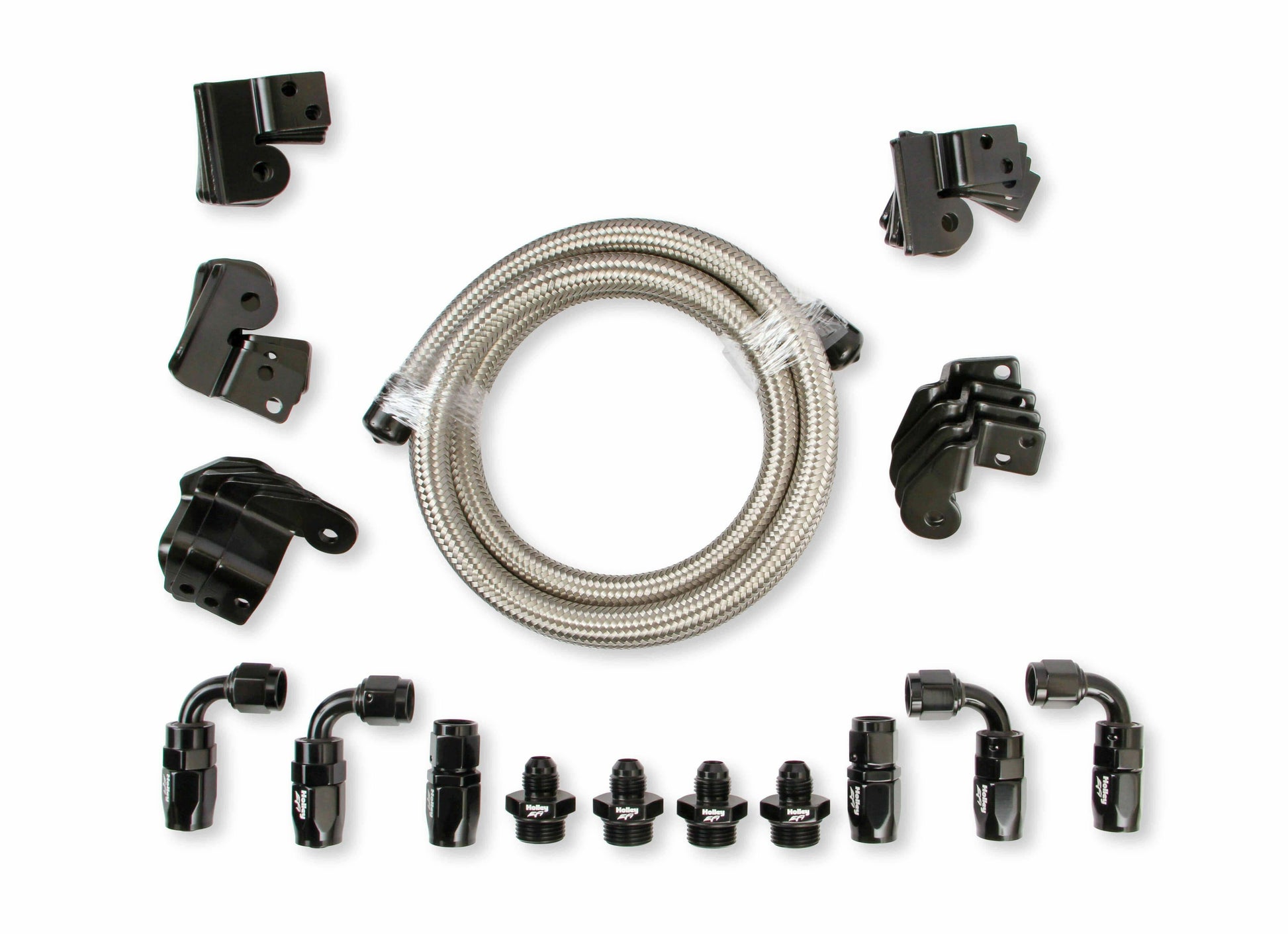 Includes (2) fuel rails (4) -6 to 3/4"-16 O-ring fittings, (6') braided hose, (4) 90º and (2) straight -6 hose ends, fuel rail mounting brackets, and required mounting hardware.