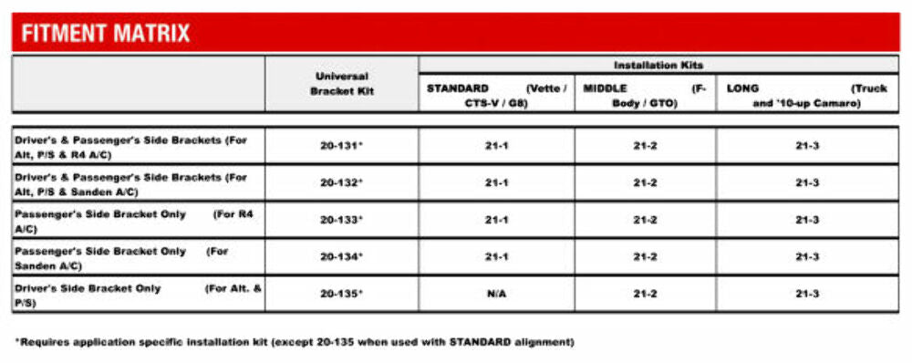 NOTES: Fits Sanden SD508 or SD7 Comp.; Requires application specific installation kit ***For all LS Engine Swaps-Please refer to your specific body style engine mount kits for additional modification and fitment requirements.