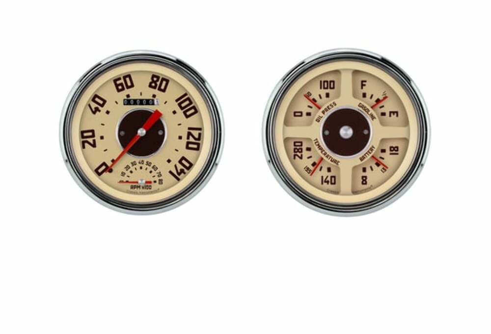 1947-53 GMC Truck Package features an all new style designed to replicate the OE look. Billet aluminum center medallions and factory-correct colors bring that retro look back into your truck while maintaining gauges that function with today's technology. It has a 4 5/8" Speedtachular (Speedo/Tach combination gauge) and Quad (Fuel, Oil, Temp, Volt combination gauge) with stainless low-step bezels and flat glass lenses.