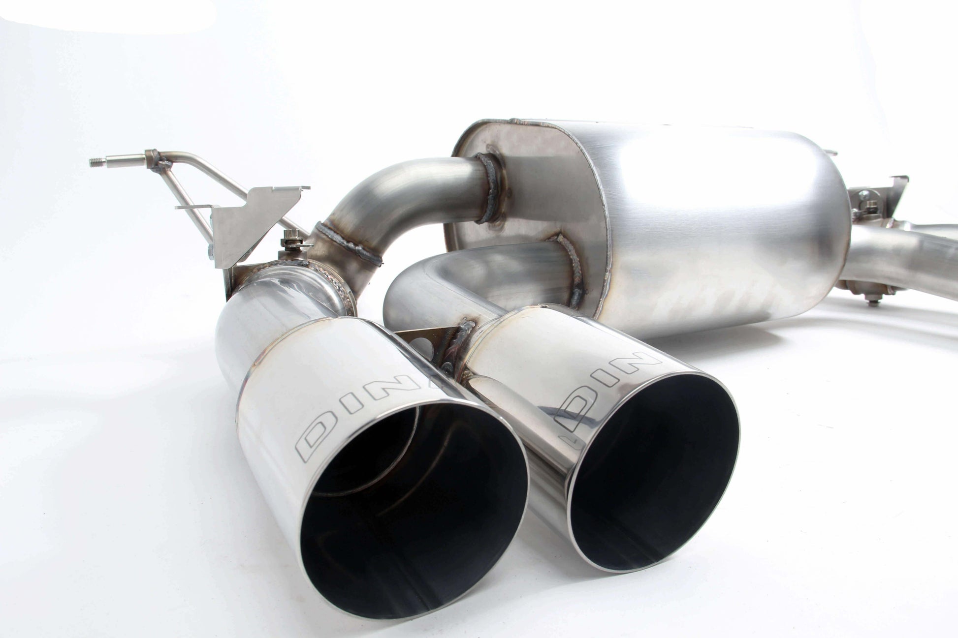 Dinan's Free Flow axle-back exhaust system features 100% stainless steel construction measured to exact specifications to ensure proper fit via factory hangers and mounting points. Dyno tuned for maximum exhaust flow with minimum backpressure, this system is designed to provide a more aggressive sound under acceleration, while reducing drone inside the vehicle, thanks to computer-controlled valves that limit noise during low-speed driving and open fully during high-load conditions to allow free flow. The exhaust gasses exit through larger laser engraved polished, or ceramic black, quad tips.