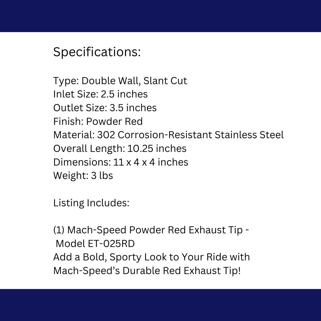 Turn heads with the Mach-Speed ET-025RD Exhaust Tip in vibrant powder-coated red! This double-walled, slant-cut exhaust tip is crafted from high-quality 302 stainless steel, providing superior durability and corrosion resistance. The bold powder red finish adds a unique pop of color to your vehicle, perfect for automotive enthusiasts who want a stylish upgrade.