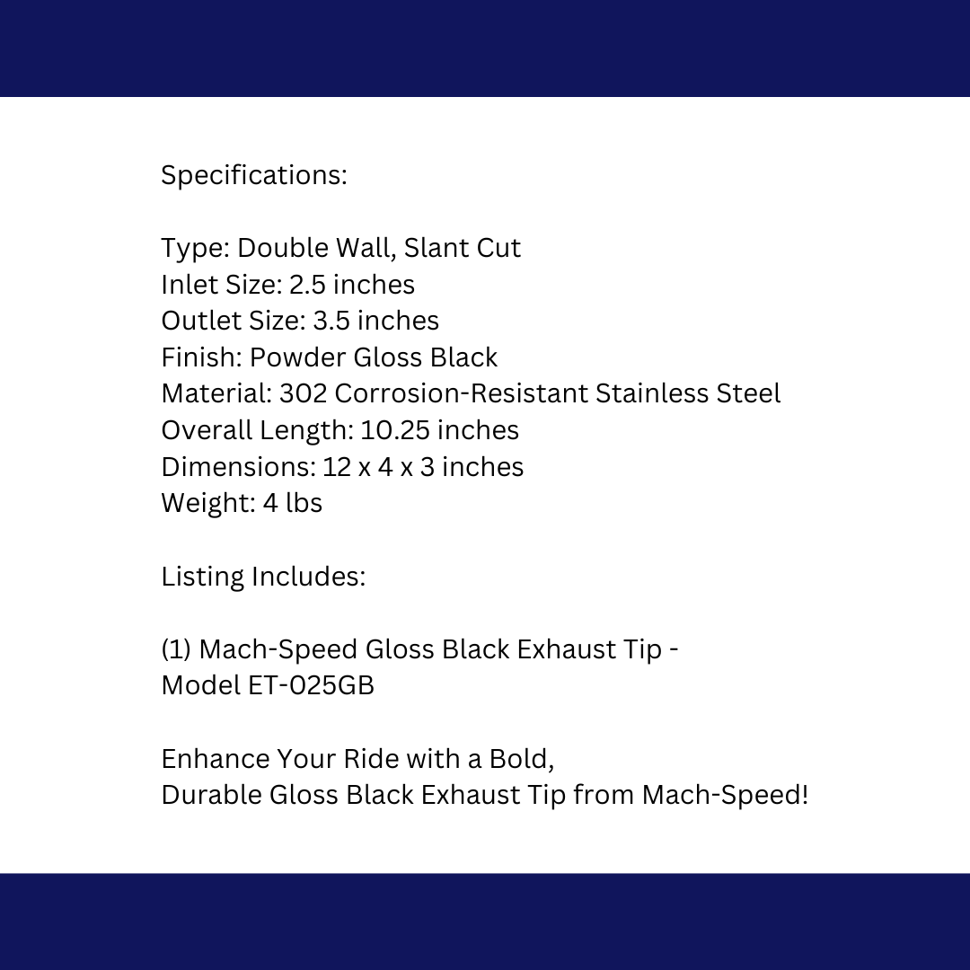 Upgrade your vehicle's appearance with the Mach-Speed ET-025GB Exhaust Tip in sleek gloss black! This double-walled, slant-cut exhaust tip is constructed from high-quality 302 stainless steel for lasting durability and corrosion resistance. The powder-coated gloss black finish adds a bold, modern edge, ideal for automotive enthusiasts seeking a stylish enhancement for their ride.