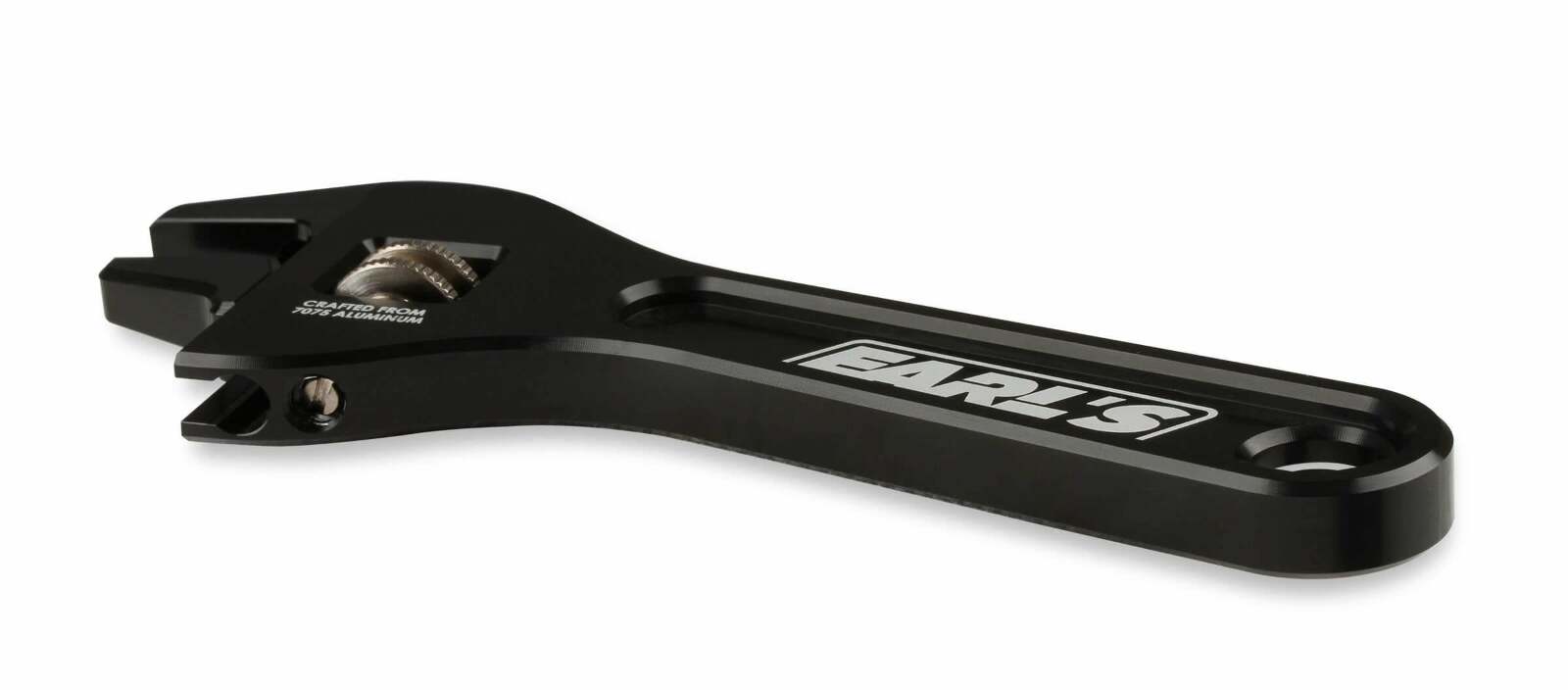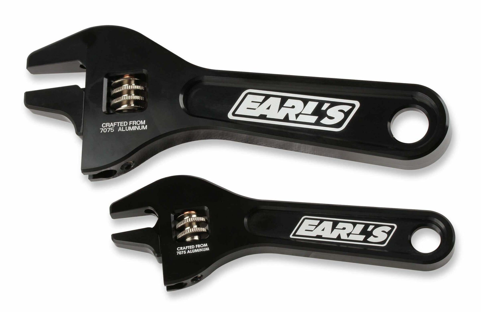 Tired of having to run to your toolbox multiple times to get the proper AN wrench? Earl's has engineered a solution! The new Earl's 2 pieces adjustable AN wrench set. These wrenches are CNC machined from true aerospace grade 7075 billet aluminum and feature a precision mechanism with a Steel Nickel knurled thumbwheel. The handles have chamfered edges that fit comfortably in your hand. Quick size adjustment make it ideal for use in the pit area, staging lanes, or back at the shop. The Mini Wrench Fits AN -3 to -8 & the Standard Wrench fits AN -3 to -12.Features: