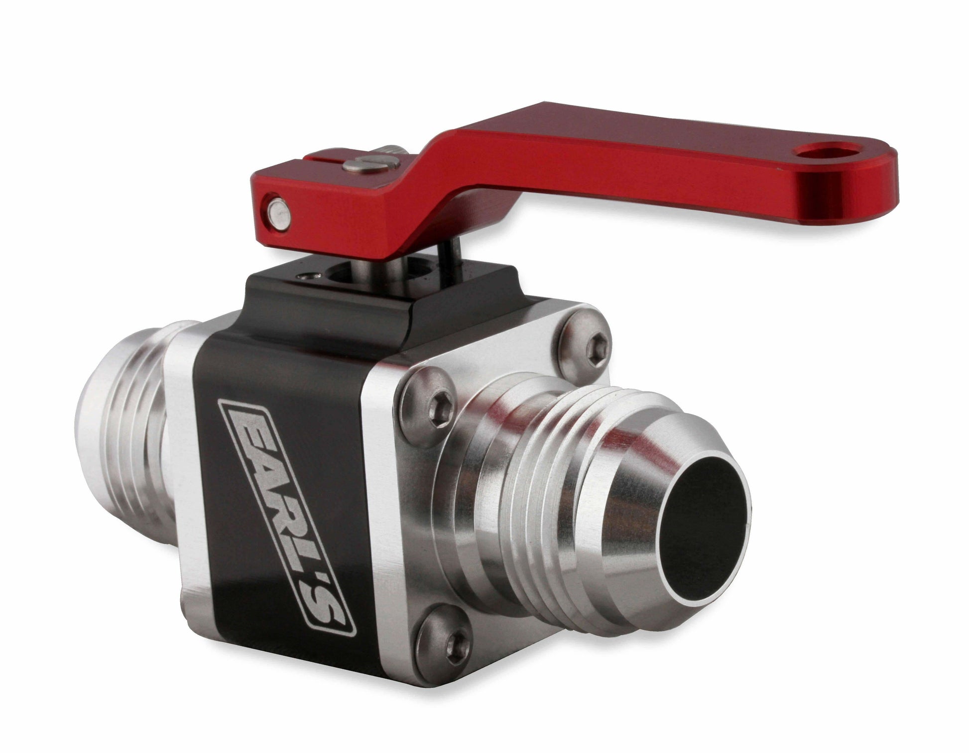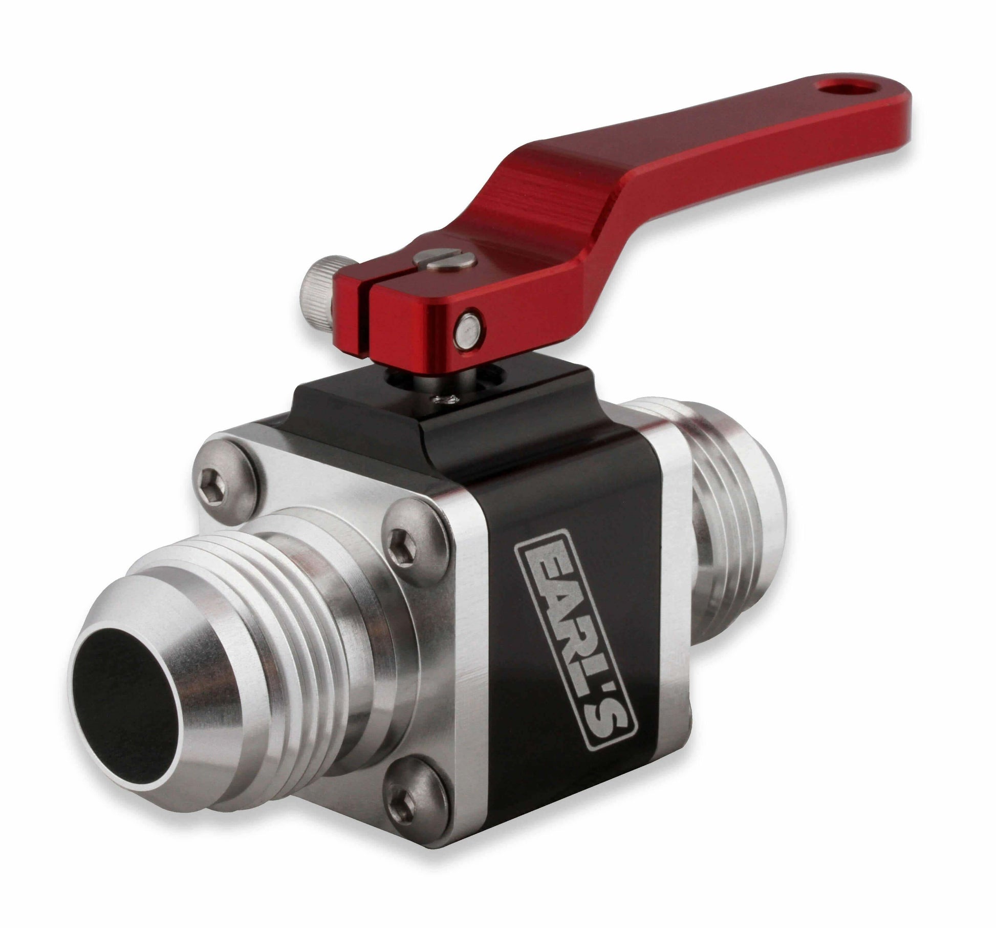 Earl's UltraPro ball valves are ideal for all racing applications & provide full uninterrupted flow when opened. The lightweight modular design is easy to rebuild and can be panel mounted using optional billet mounting brackets. The glass reinforced PTFE seals are compatible with gasoline, racing fuels, methanol, alcohol, E85, oil, water & coolant. The small body valves are available in -6 & -8 AN sizes, and the large body valves are available in -10 & -12 AN sizes (choose from male/male, or male/female styles). Attractive clear & black anodized finish w/ red handle. The handle features a 1/4" hole for cable operation & is curved outward from the body for easy operation w/ extra finger clearance (even w/ racing gloves). These racing ball valves are ideal for use in most fuel and oil systems (i.e. fuel shut-off valves, oil accumulators/accusump™ systems, and many other applications).Features: