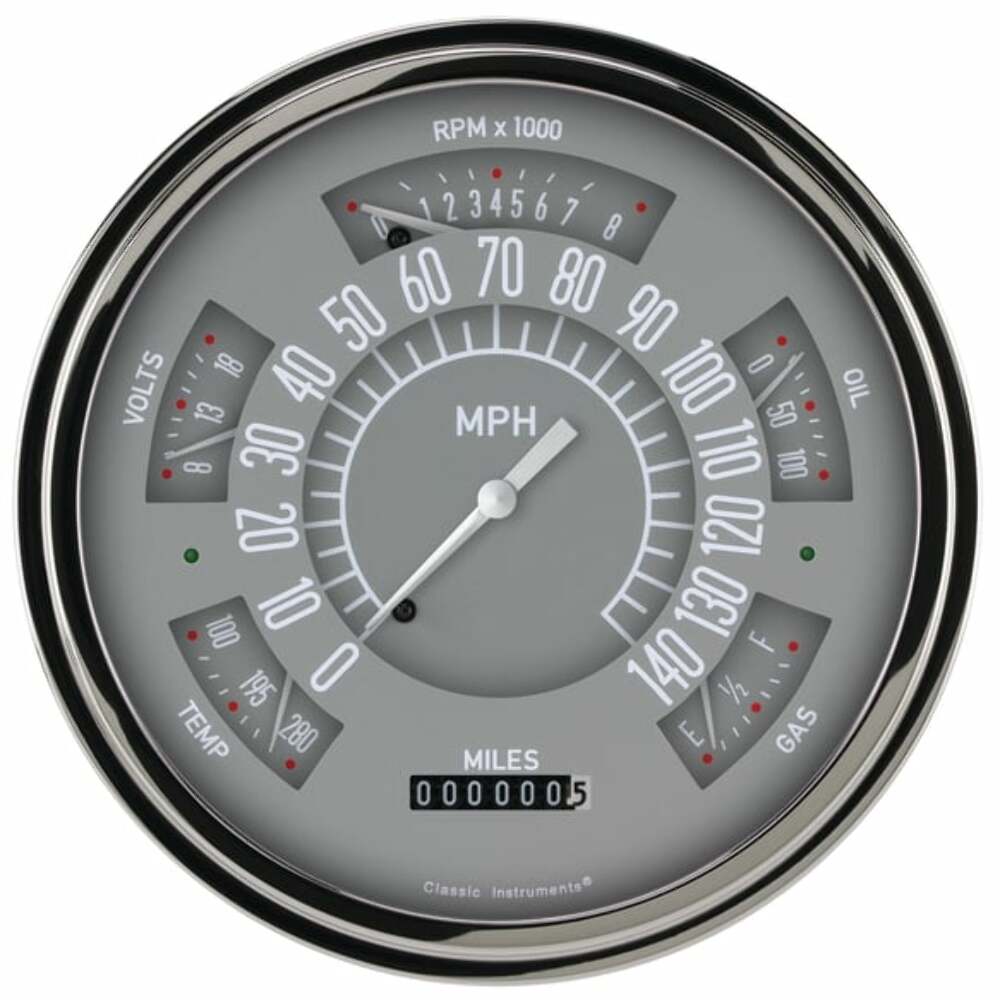 The '49-'50 Chevy Package features the speedometer, tachometer, fuel, temperature, volt, and oil gauges all in one direct fit instrument. Installing the all-electronic cluster is easy with the included mounting hardware, Classic Instruments' Zeus Speedometer Technology for push button calibration, and all the included sending units.