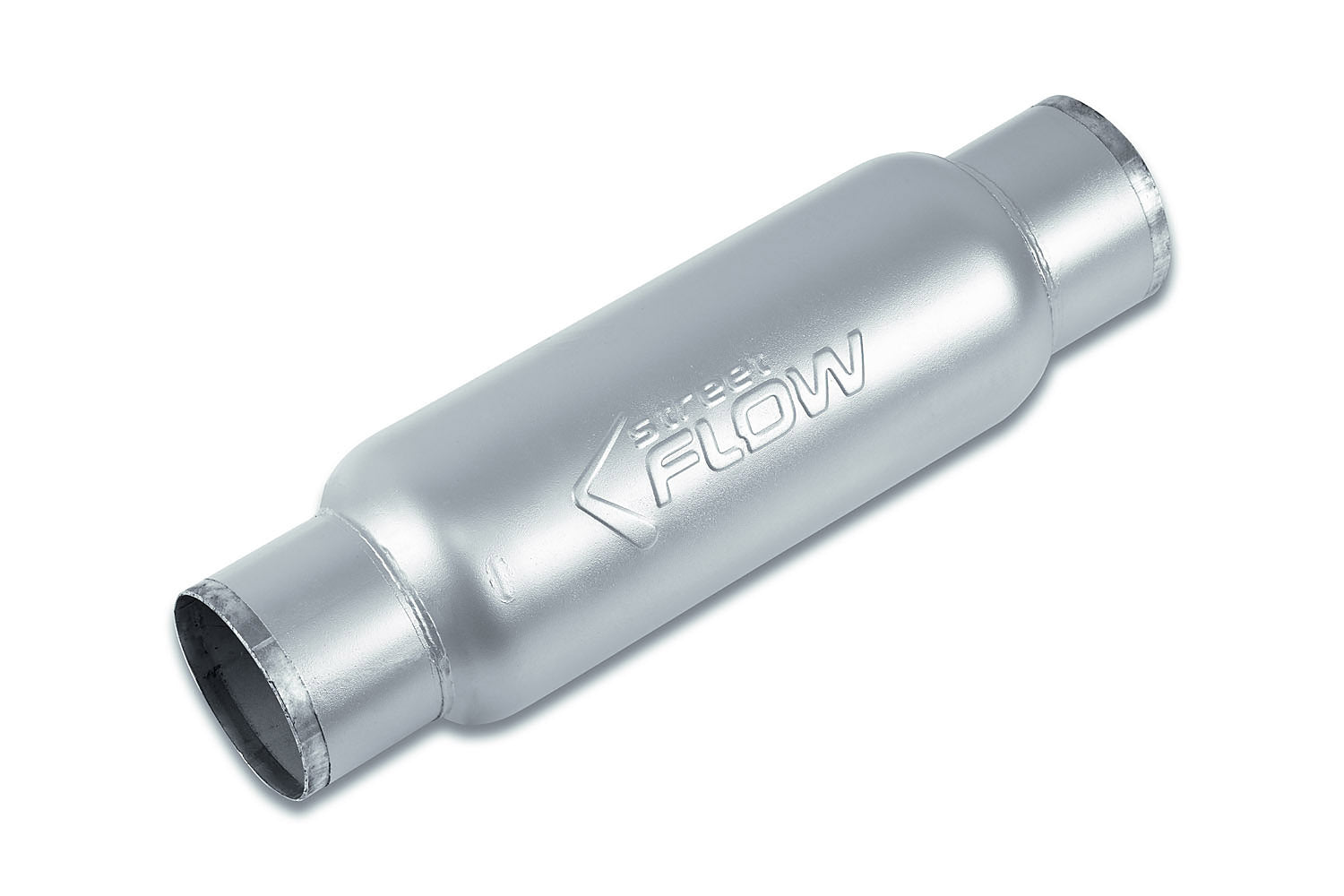 Street Flow, Round Body Chambered Muffler, Aggressive Tone, 16-Gauge Aluminized Steel, Premium Powder Coat Finish, 5.0" Body, 3.0" In, 3.0" Out, 3 Year Limited Warranty.