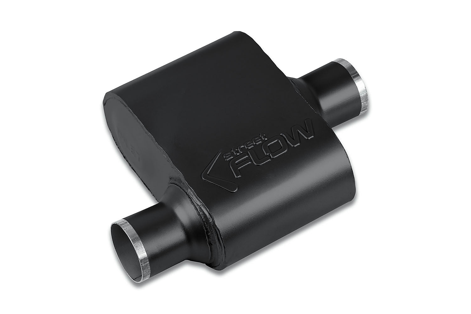 Street Flow Stainless, 1 Chamber Performance Muffler, Aggressive Tone, 16-Gauge 409-Grade Stainless Steel, Premium Powder Coat Finish, 2.5" Offset In, 2.5" Center Out, 5 Year Limited Warranty.