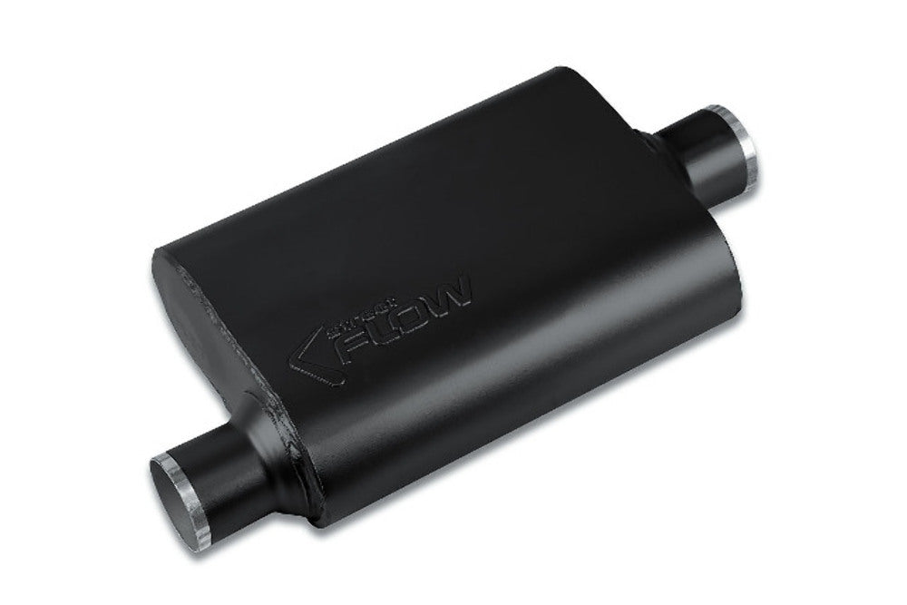 Street Flow Stainless, 2 Chamber Performance Muffler, Aggressive to Moderate Tone, 16-Gauge 409-Grade Stainless Steel, Premium Powder Coat Finish, 2.5" Offset In, 2.5" Center Out, 5 Year Limited Warranty.