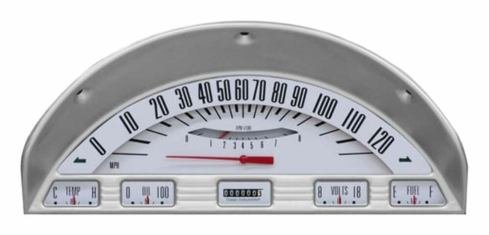 1956 Ford F-100 Truck Package White 6-in-One package includes 120 MPH Speedometer, 8,000 RPM Tachometer, Fuel (75-10 OHM), Oil, Temp, and Volt. The completely assembled unit includes housing, wiring harness and all necessary sending units. Features push button calibration, LED illumination, integrated turn signals and a red Halo high beam indicator. It features our ZST so it does not require any additional control boxes.