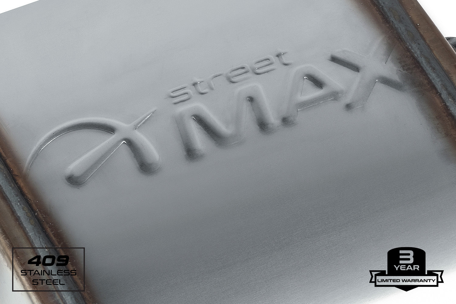 Street Max, Stainless Straight-Through Performance Muffler, 4.0" x 9.0" x 7.0" Oval Body, Aggressive Tone, 16-Gauge 409-Grade Stainless Steel, Satin Finish, 2.5" Offset In, 2.5" Center Out, Reversible, 3 Year Limited Warranty.
