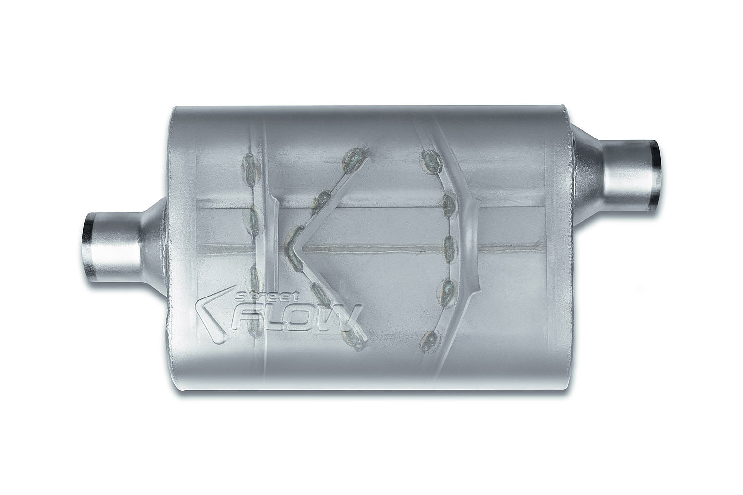 Street Flow, 2 Chamber Performance Muffler, Aggressive to Moderate Tone, 16-Gauge Aluminized Steel, Premium Powder Coat Finish, 2.25" Center In, 2.25" Offset Out, 3 Year Limited Warranty.