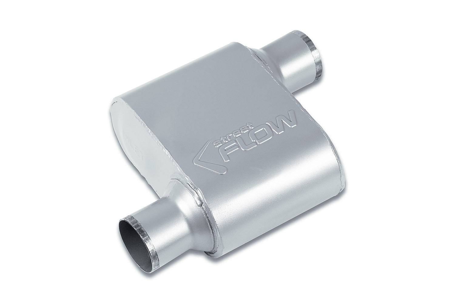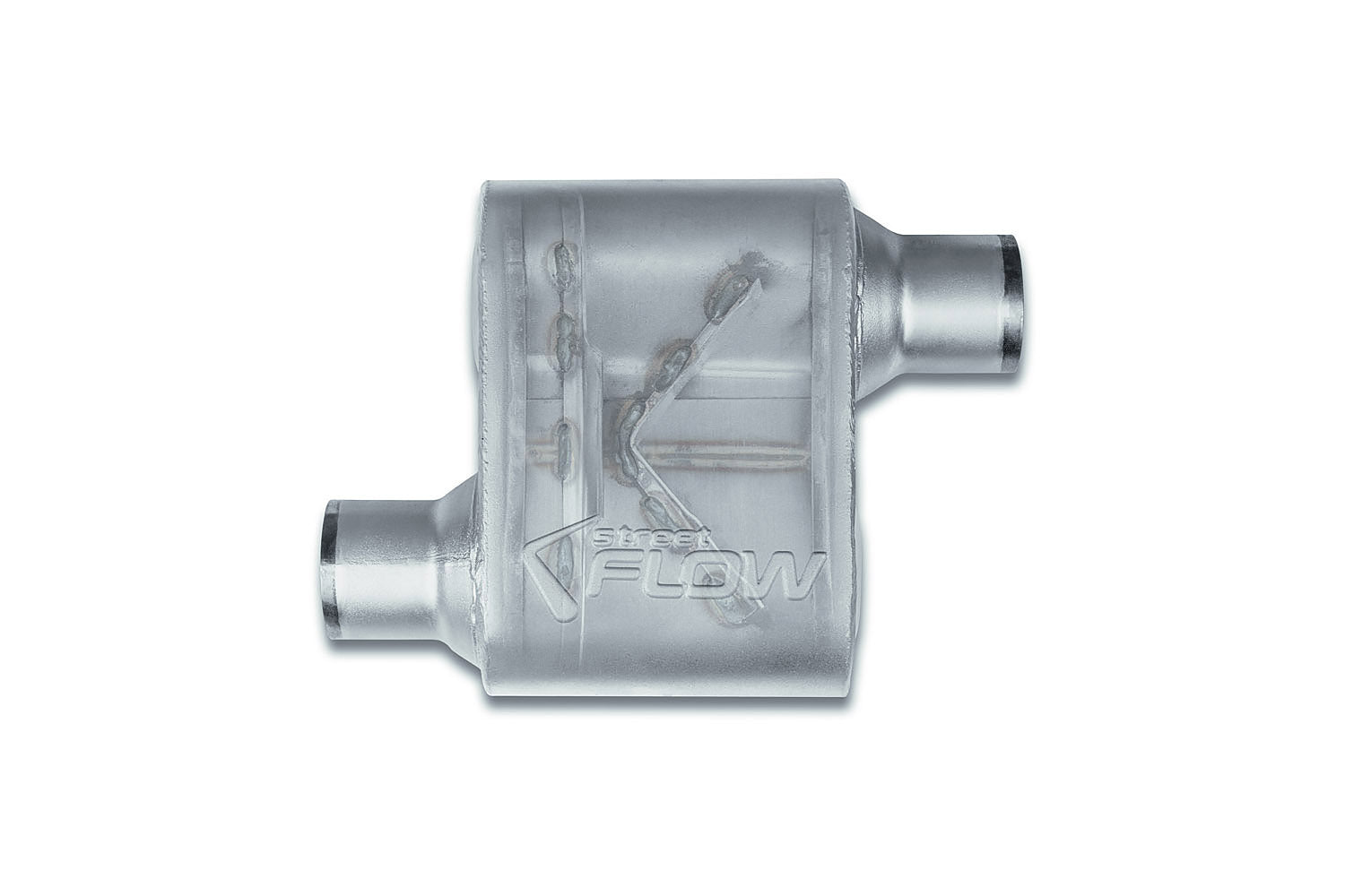 Street Flow, 1 Chamber Performance Muffler, Aggressive Tone, 16-Gauge Aluminized Steel, Premium Powder Coat Finish, 2.5" Offset In, 2.5" Offset Out, 3 Year Limited Warranty.
