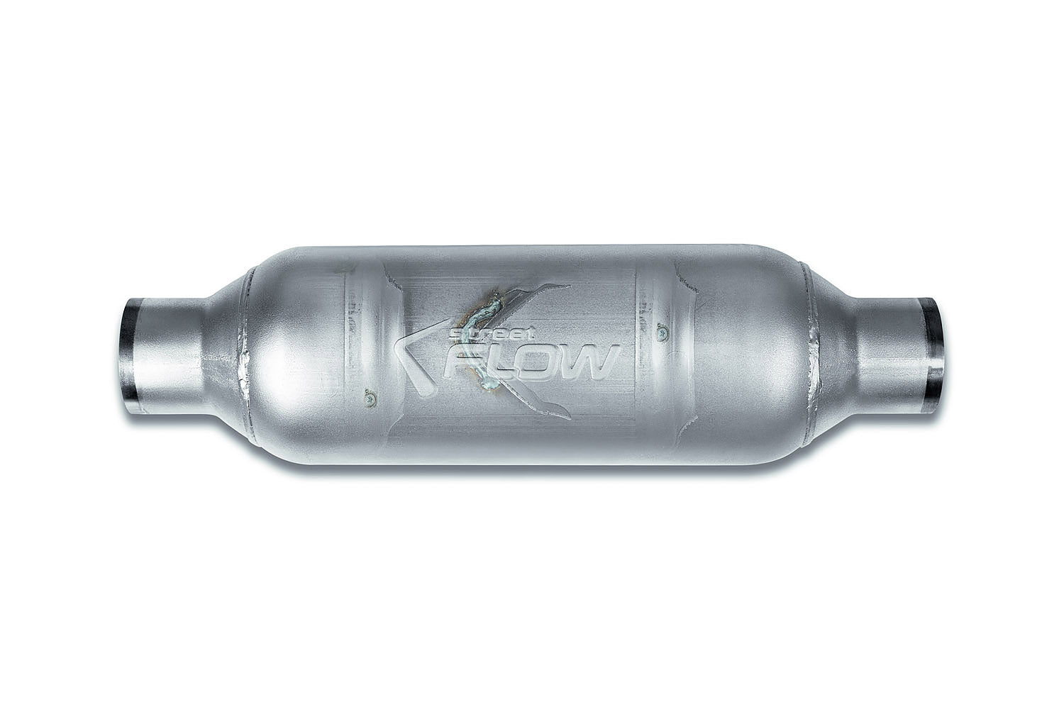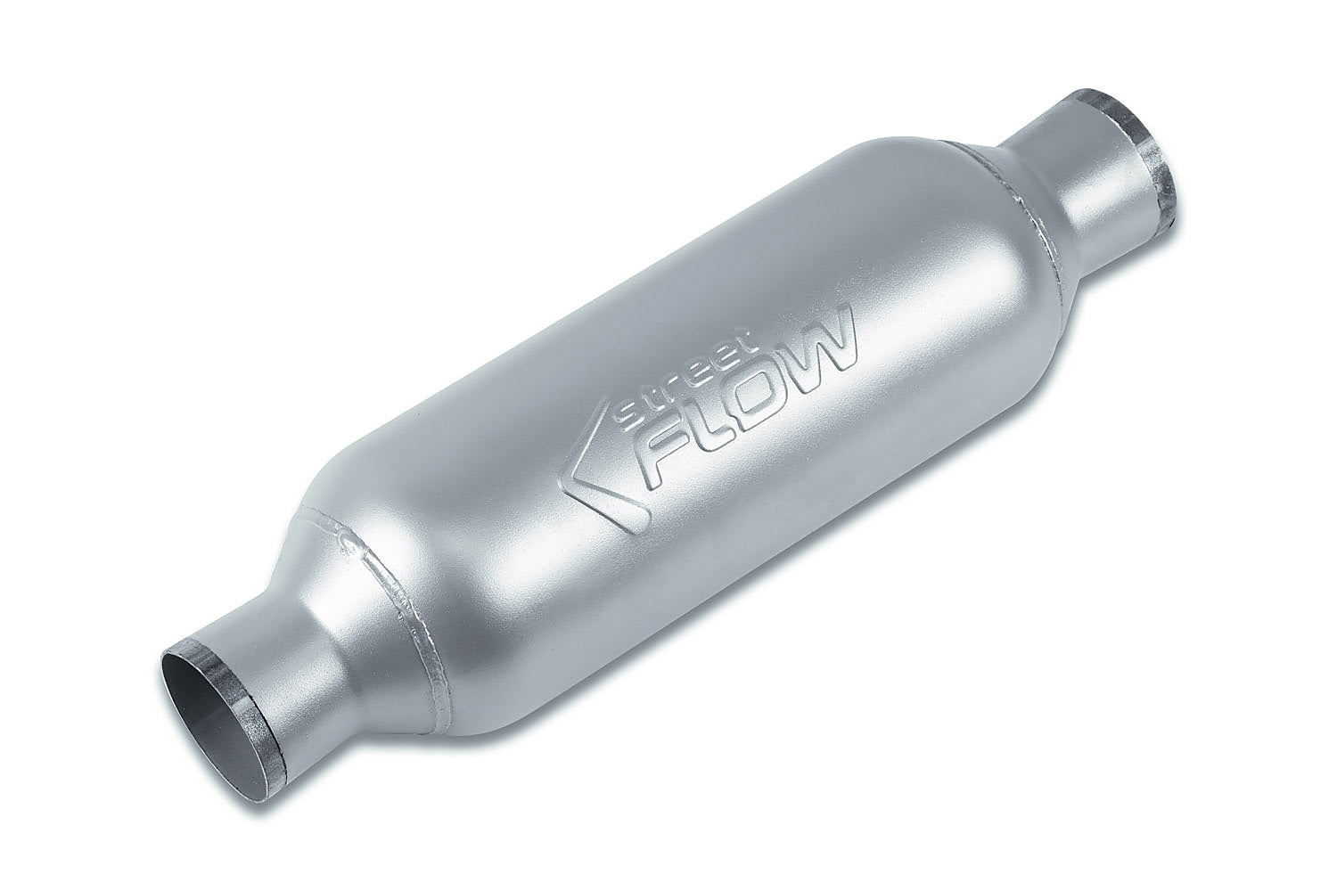 Street Flow, Round Body Chambered Muffler, Aggressive Tone, 16-Gauge Aluminized Steel, Premium Powder Coat Finish, 5.0" Body, 2.5" In, 2.5" Out, 3 Year Limited Warranty.