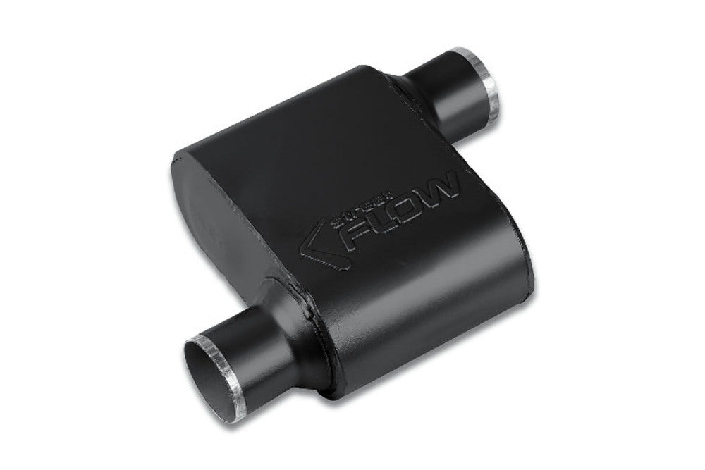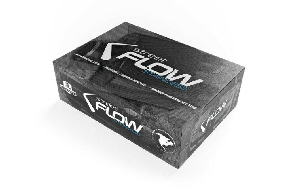 Street Flow Stainless, 1 Chamber Performance Muffler, Aggressive Tone, 16-Gauge 409-Grade Stainless Steel, Premium Powder Coat Finish, 2.5" Offset In, 2.5" Offset Out, 5 Year Limited Warranty.