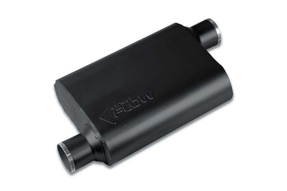 Street Flow Stainless, 2 Chamber Performance Muffler, Aggressive to Moderate Tone, 16-Gauge 409-Grade Stainless Steel, Premium Powder Coat Finish, 2.5" Offset In, 2.5" Offset Out, 5 Year Limited Warranty.