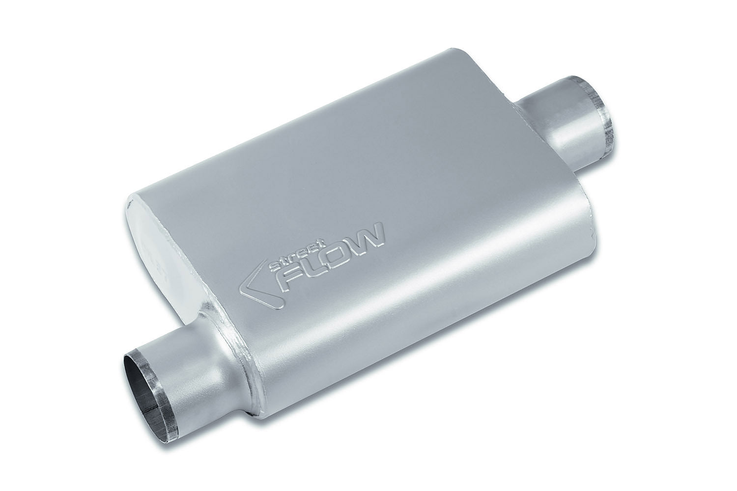 Street Flow, 2 Chamber Performance Muffler, Aggressive to Moderate Tone, 16-Gauge Aluminized Steel, Premium Powder Coat Finish, 3.0" Offset In, 3.0" Center Out, 3 Year Limited Warranty.