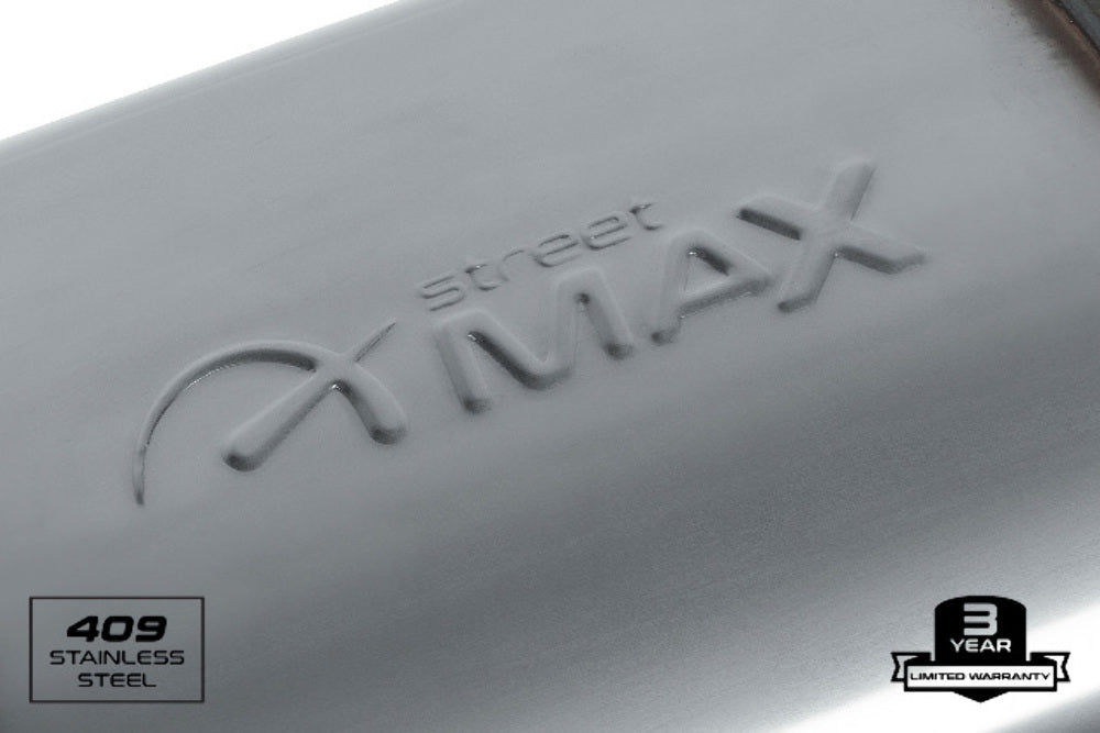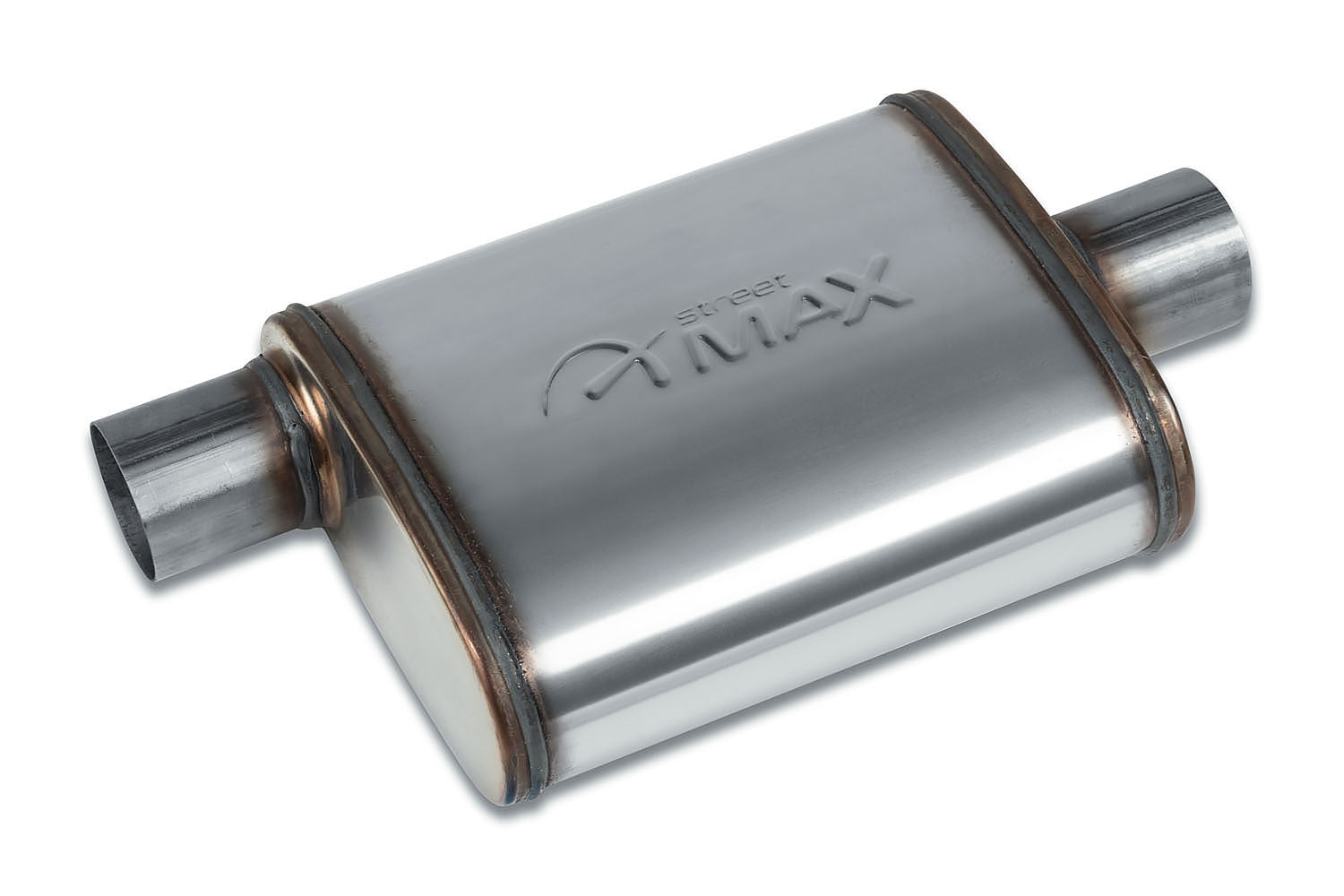 Street Max, Stainless Straight-Through Performance Muffler, 4.0" x 9.0" x 11.0" Oval Body, Aggressive to Moderate Tone, 16-Gauge 409-Grade Stainless Steel, Satin Finish, 2.5" Offset In, 2.5" Center Out, Reversible, 3 Year Limited Warranty.