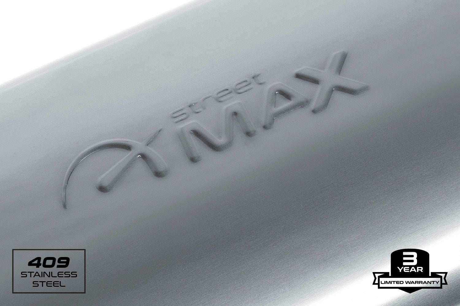 Street Max, Stainless Straight-Through Performance Muffler, 4.0" x 9.0" x 14.0" Oval Body, Aggressive to Moderate Tone, 16-Gauge 409-Grade Stainless Steel, Satin Finish, 2.5" Offset In, 2.5" Offset Out, Reversible, 3 Year Limited Warranty.