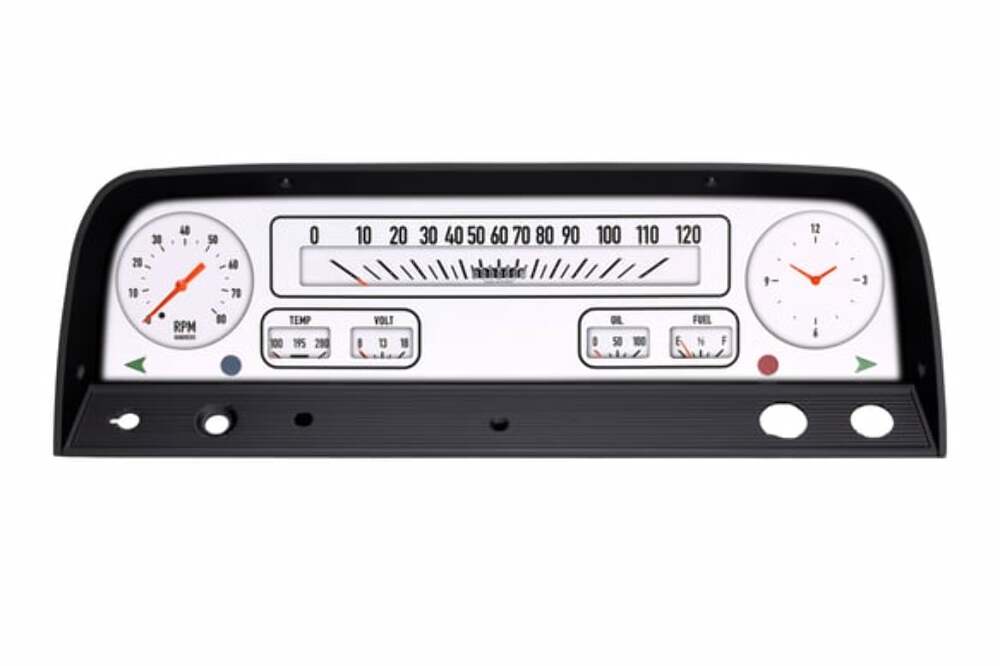 The 1964-66 Chevy truck direct-fit cluster features a speedometer, tachometer, fuel, oil, temperature, and volt gauges, and a 12V quartz clock decked out in one of four color schemes: black, tan, white, or Gray. Choose black for a near-stock appearance or select one of the other color options to match your project! The all-electric cluster with easy snap-in wiring harness arrives ready to install directly into the stock dash of 64-66 trucks; no cutting or alterations necessary. Perhaps the best install feature: the cluster includes Classic Instruments' Zeus Speedometer Technology built right in which means no external control boxes. It is designed to re-use the factory dash bezel, bezel not included, to maintain the original styling of the vehicle, but has been upgraded with bright LED lighting for even illumination and clear nighttime readability; light dimming control is built-in. Everything else needed to install the package is provided in the kit including a scratch-resistant acrylic lens and all necessary sending units. No need to worry about fuel sending unit compatibility either, the cluster features a fuel sending unit selector switch to set it for compatibility with the existing/factory fuel sending unit, no new sending unit necessary.