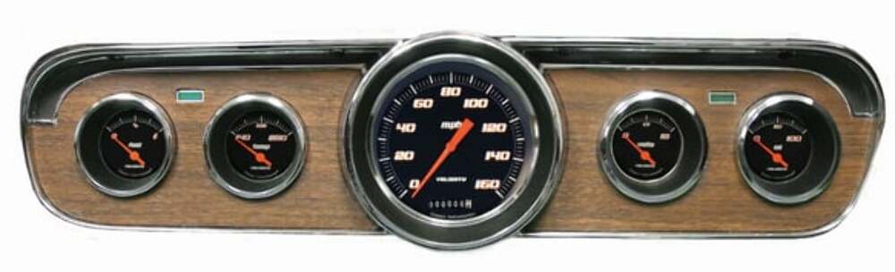1965-66 Mustang Package Velocity Series Black 3 3/8" Speedometer, 2 1/8" Fuel (75-10 OHM), Oil, Temp, and Volt. Red Halo high beam indicator installed in speedometer. The package is complete with necessary sending units, turn signal bulbs, and a gauge mounting bracket designed to work with your existing stock or reproduction bezel.