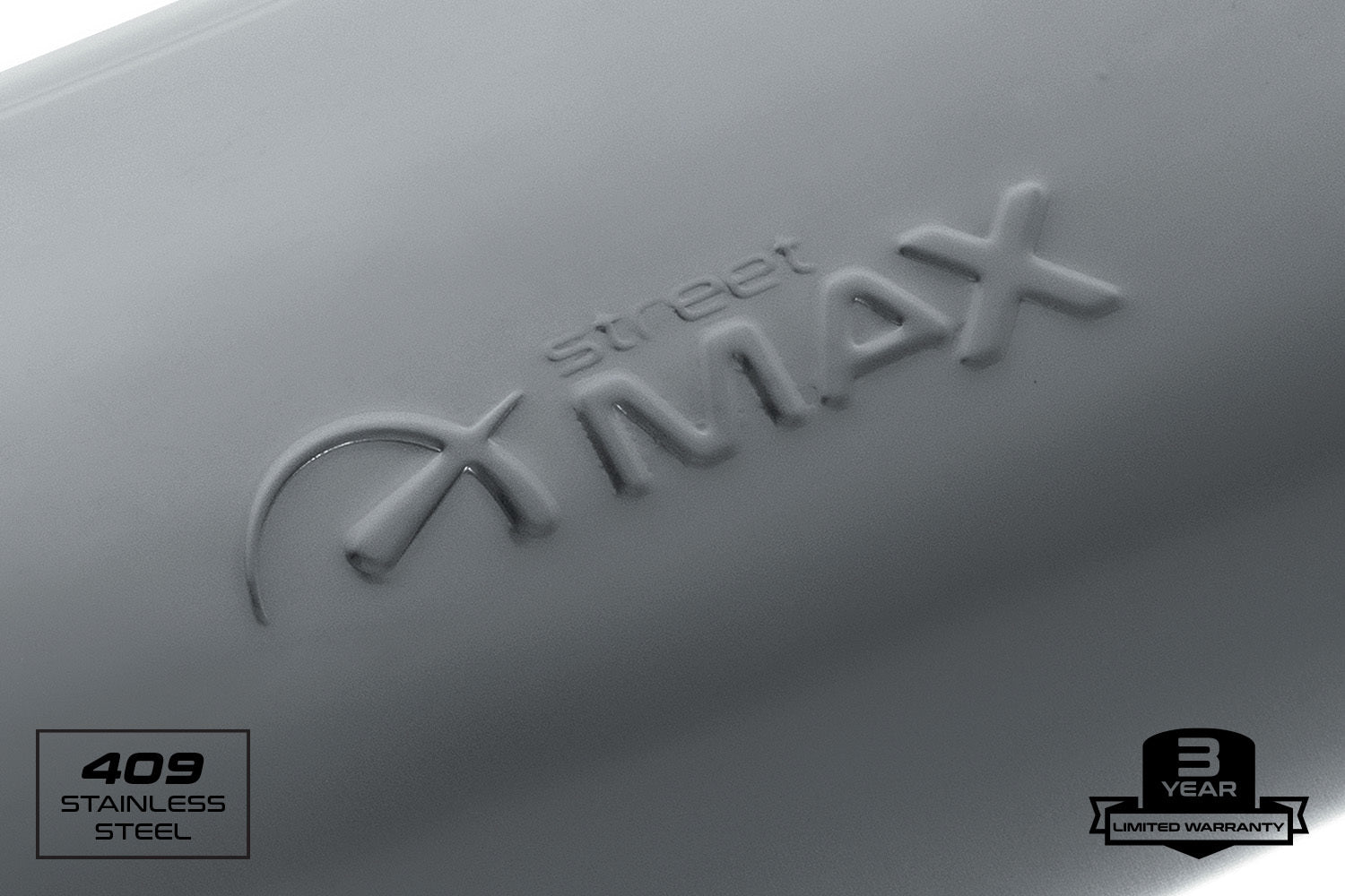 Street Max, Stainless Straight-Through Performance Muffler, 5.0" x 11.0" x 22.0" Oval Body, Mild Tone, 16-Gauge 409-Grade Stainless Steel, Satin Finish, 2.5" Dual In, 2.5" Dual Out, Reversible, 3 Year Limited Warranty.