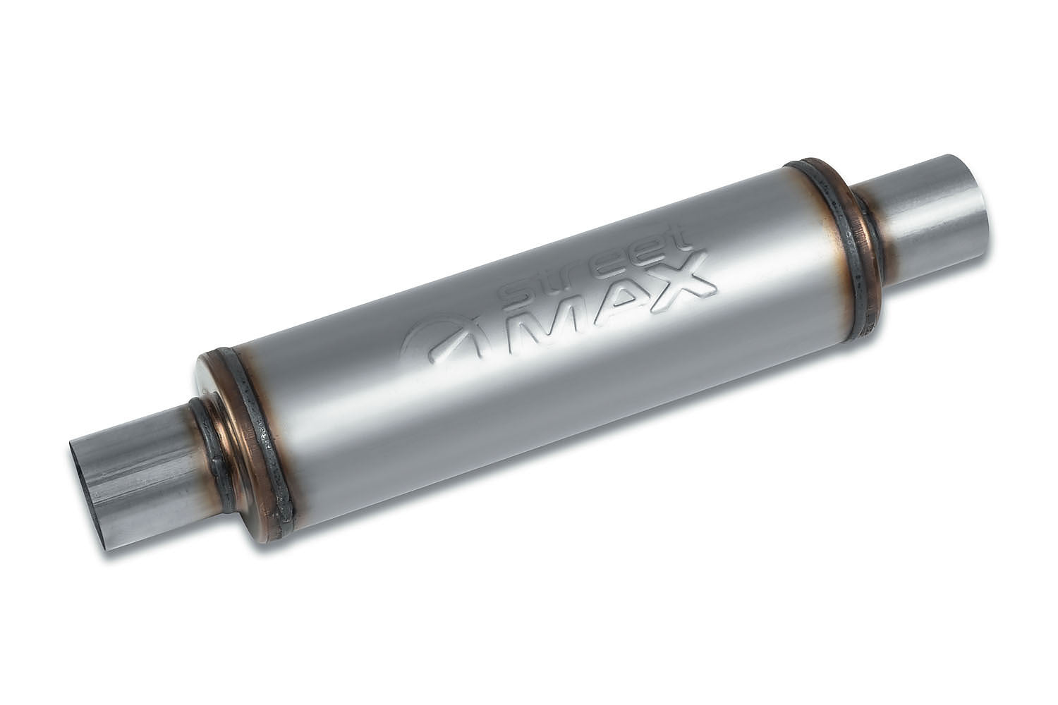 Street Max, Stainless Straight-Through Performance Muffler, 4.0" x 14.0" Round Body, Aggressive to Moderate Tone, 16-Gauge 409-Grade Stainless Steel, Satin Finish, 2.25" Center In, 2.25" Center Out, Reversible, 3 Year Limited Warranty.