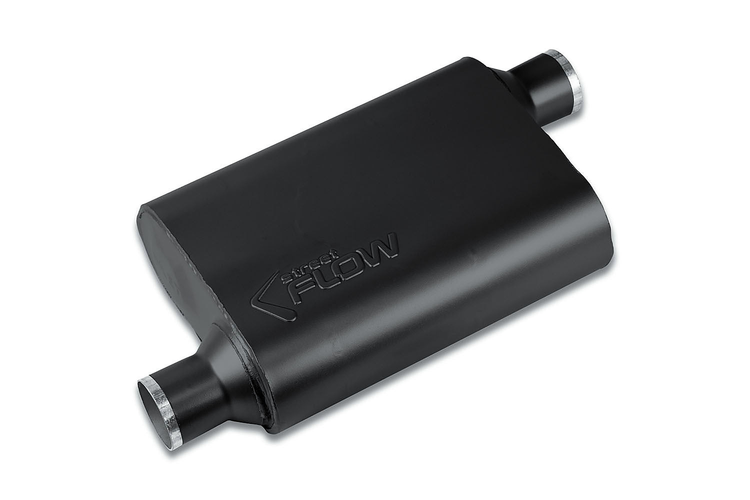 Street Flow Stainless, 1 Chamber Performance Muffler, Aggressive Tone, 16-Gauge 409-Grade Stainless Steel, Premium Powder Coat Finish, 2.25" Offset In, 2.25" Offset Out, 5 Year Limited Warranty.