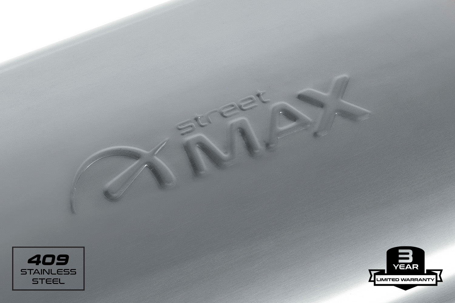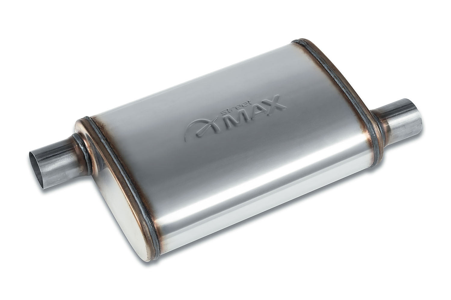 Street Max, Stainless Straight-Through Performance Muffler, 4.0" x 9.0" x 14.0" Oval Body, Aggressive to Moderate Tone, 16-Gauge 409-Grade Stainless Steel, Satin Finish, 2.0" Offset In, 2.0" Offset Out, Reversible, 3 Year Limited Warranty.