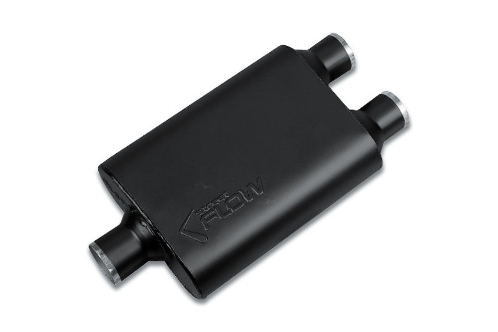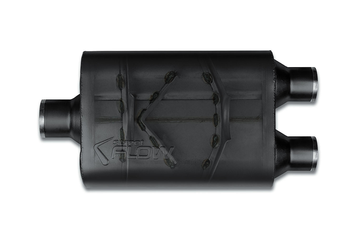 Street Flow Stainless, 2 Chamber Performance Muffler, Aggressive to Moderate Tone, 16-Gauge 409-Grade Stainless Steel, Premium Powder Coat Finish, 2.5" Center In, 2.25" Dual Out, 5 Year Limited Warranty.