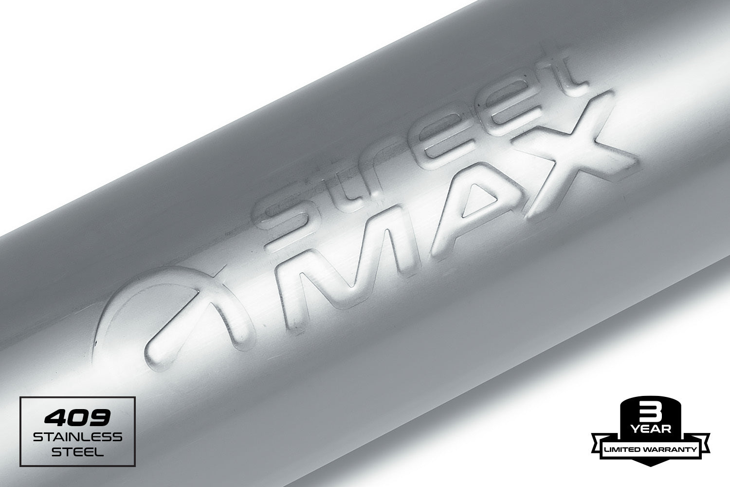 Street Max, Stainless Straight-Through Performance Muffler, 4.0" x 22.0" Round Body, Mild Tone, 16-Gauge 409-Grade Stainless Steel, Satin Finish, 2.5" Center In, 2.5" Center Out, Reversible, 3 Year Limited Warranty.