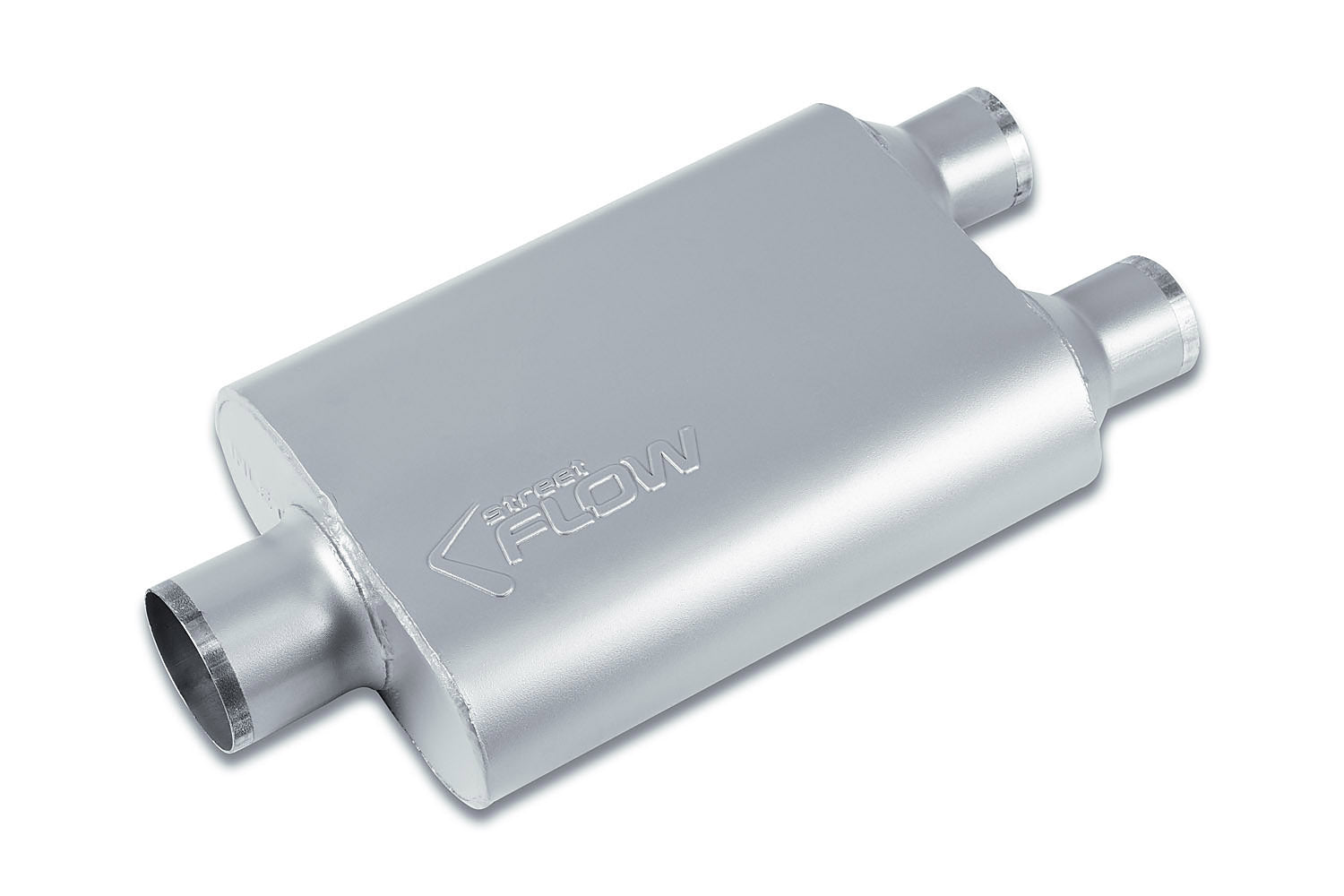 Street Flow, 2 Chamber Performance Muffler, Aggressive to Moderate Tone, 16-Gauge Aluminized Steel, Premium Powder Coat Finish, 3.0" Center In, 2.25" Dual Out, 3 Year Limited Warranty.