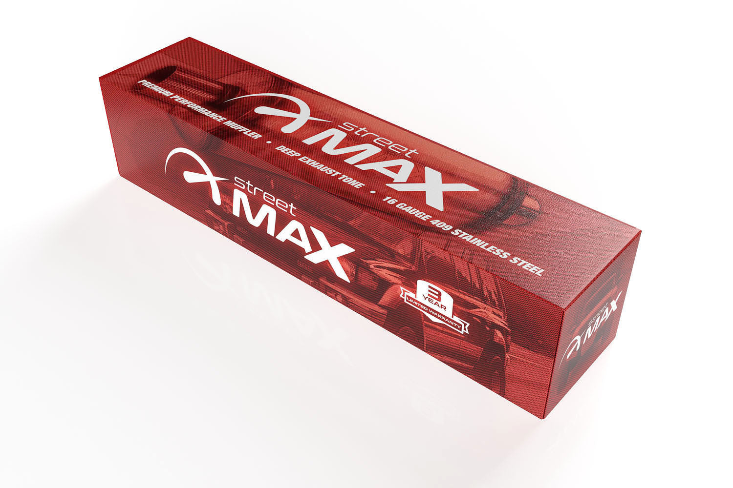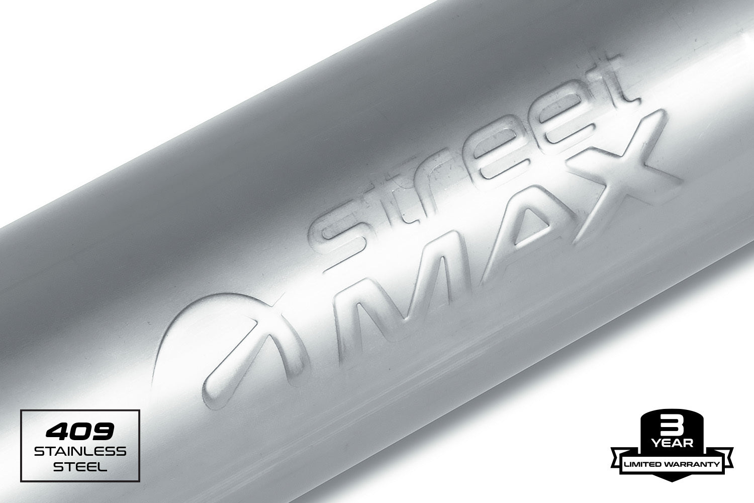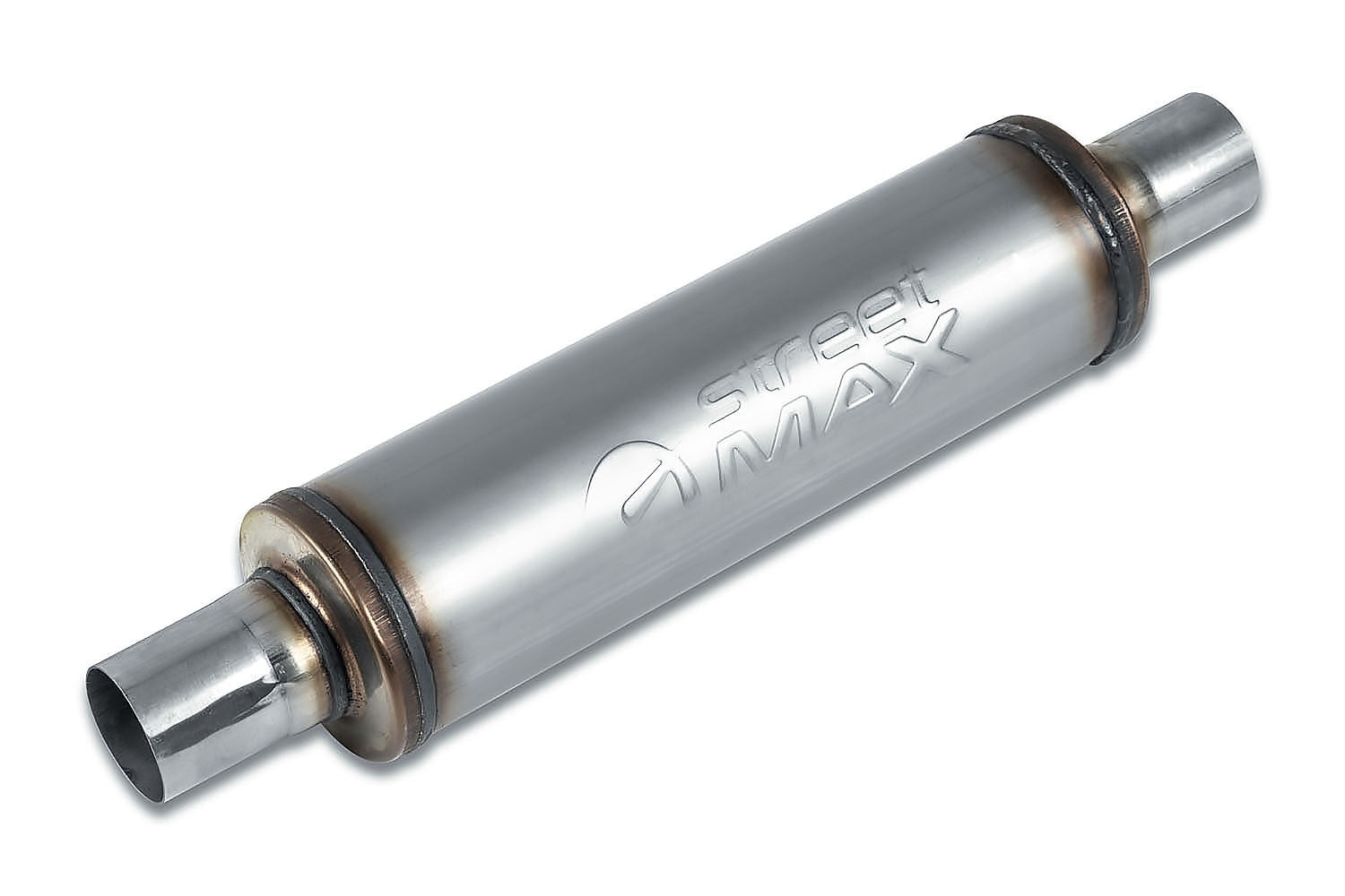 Street Max, Stainless Straight-Through Performance Muffler, 4.0" x 14.0" Round Body, Aggressive to Moderate Tone, 16-Gauge 409-Grade Stainless Steel, Satin Finish, 2.0" Center In, 2.0" Center Out, Reversible, 3 Year Limited Warranty.