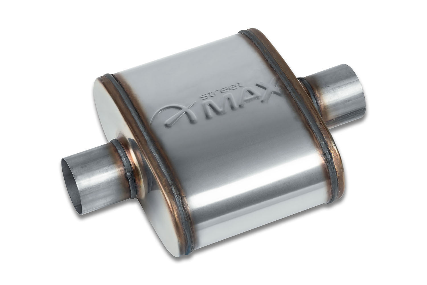 Street Max, Stainless Straight-Through Performance Muffler, 4.0" x 9.0" x 7.0" Oval Body, Aggressive Tone, 16-Gauge 409-Grade Stainless Steel, Satin Finish, 2.25" Center In, 2.25" Center Out, Reversible, 3 Year Limited Warranty.