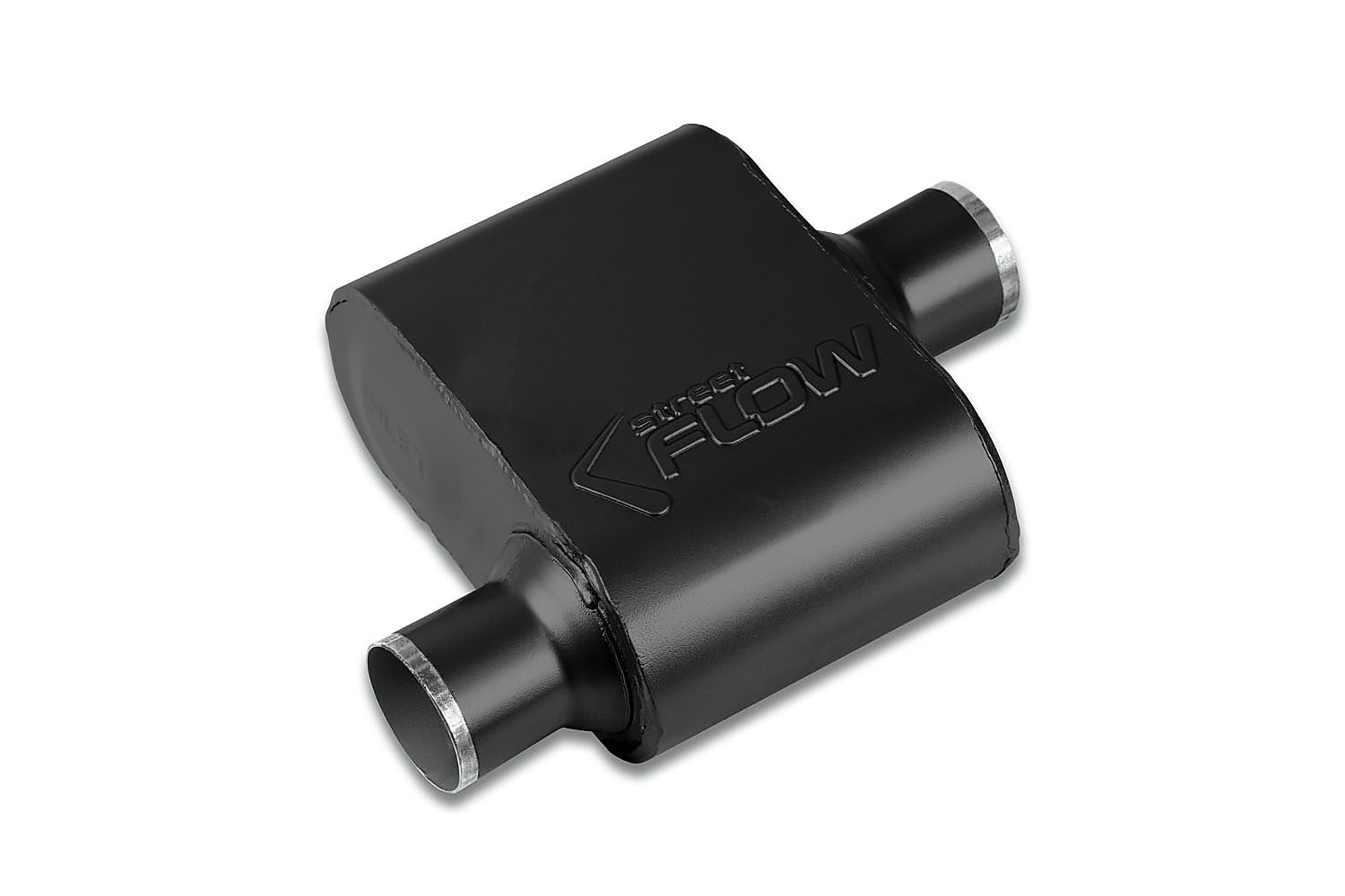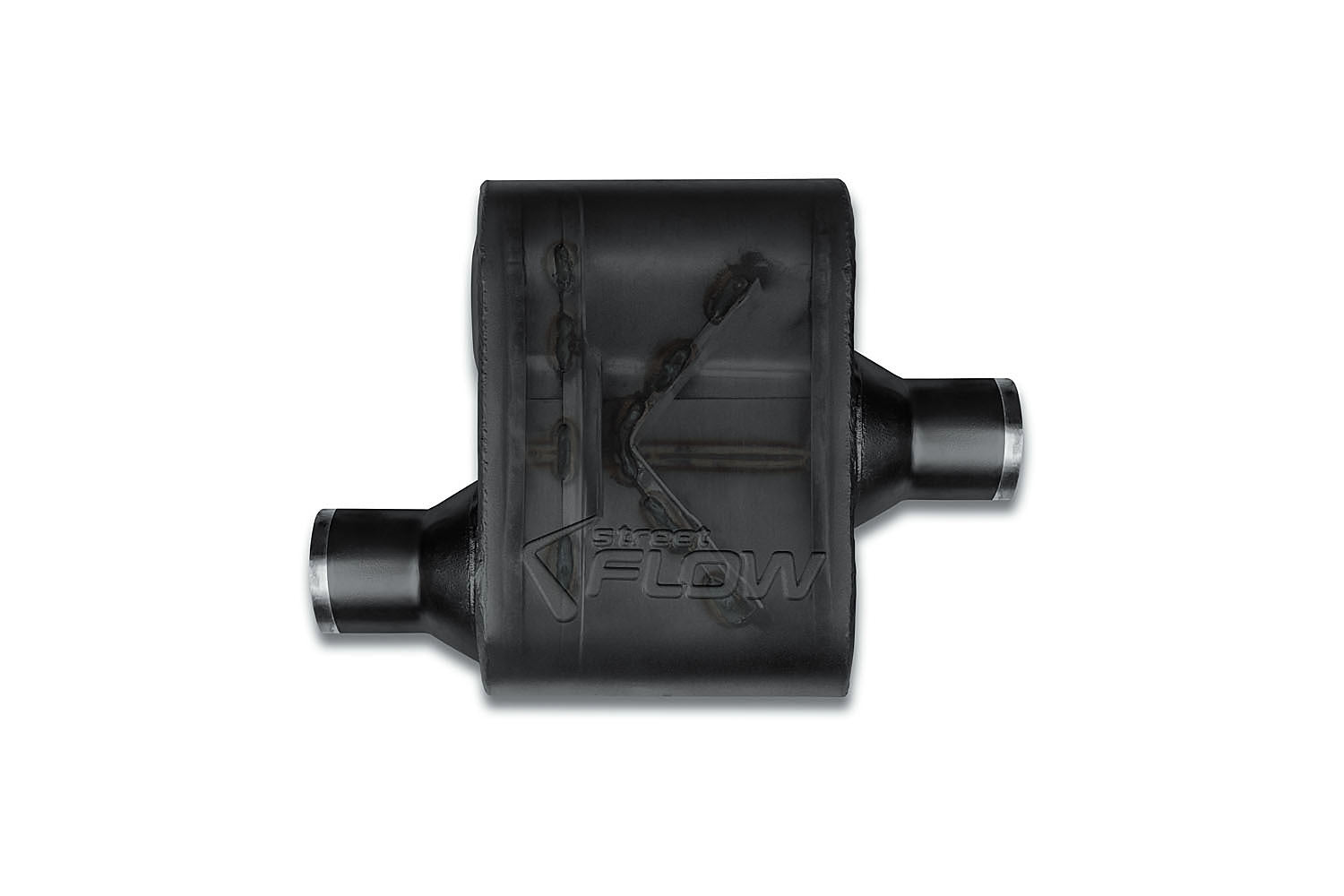 Street Flow Stainless, 1 Chamber Performance Muffler, Aggressive Tone, 16-Gauge 409-Grade Stainless Steel, Premium Powder Coat Finish, 2.25" Offset In, 2.25" Center Out, 5 Year Limited Warranty.