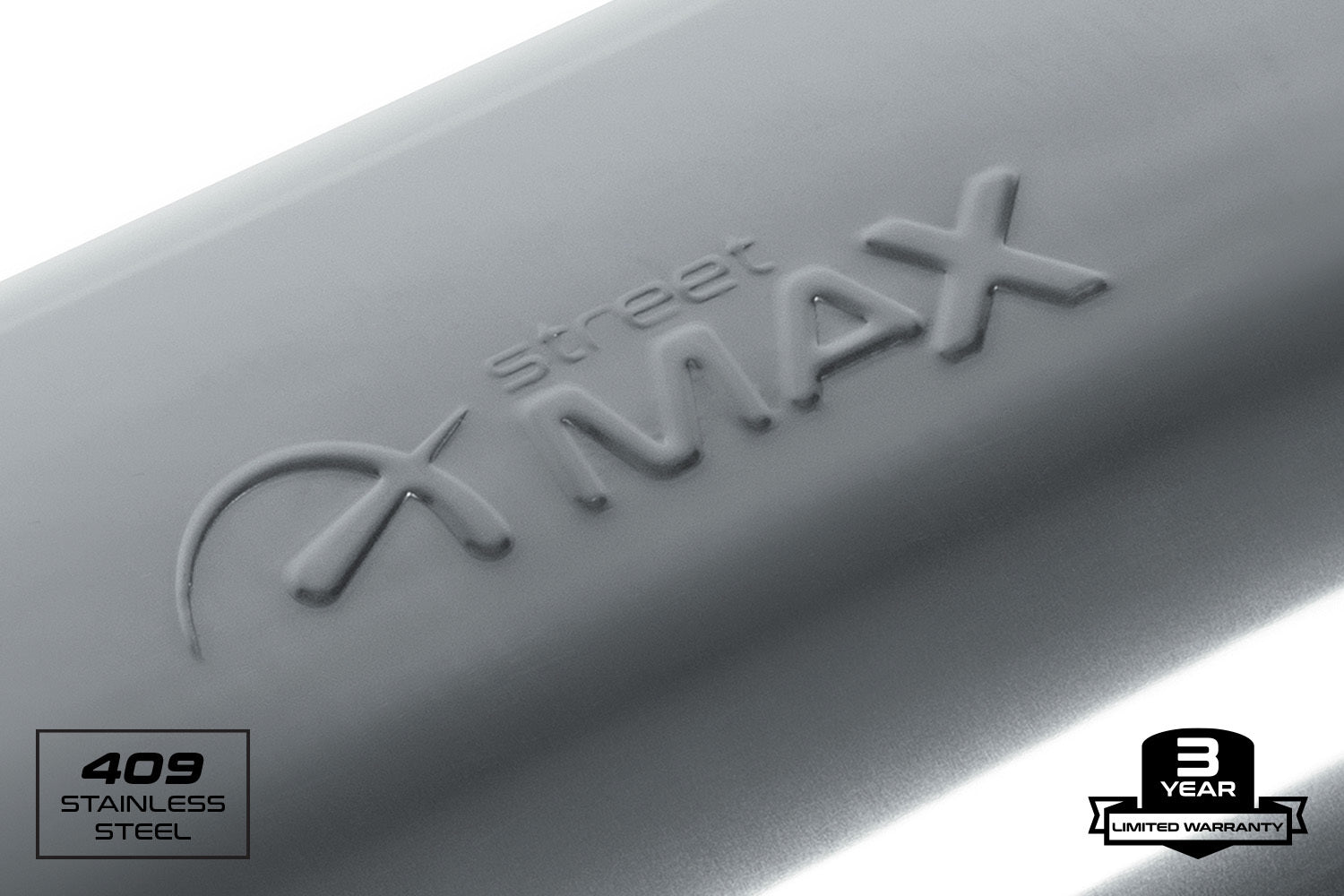 Street Max, Stainless Straight-Through Performance Muffler, 5.0" x 8.0" x 24.0" Oval Body, Mild Tone, 16-Gauge 409-Grade Stainless Steel, Satin Finish, 2.5" Offset In, 2.5" Center In, Reversible, 3 Year Limited Warranty.
