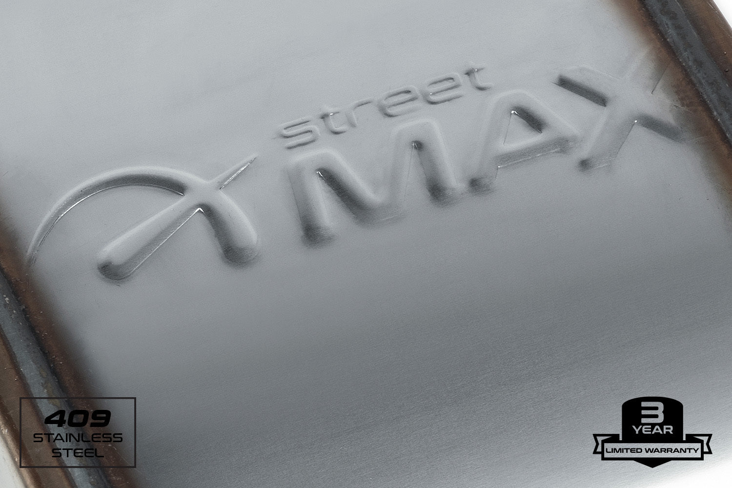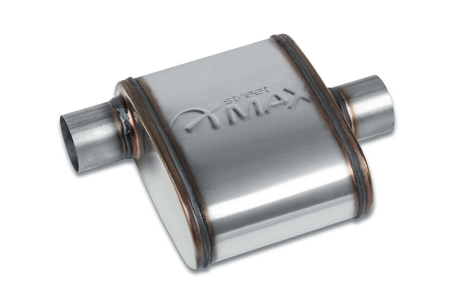 Street Max, Stainless Straight-Through Performance Muffler, 4.0" x 9.0" x 7.0" Oval Body, Aggressive Tone, 16-Gauge 409-Grade Stainless Steel, Satin Finish, 2.25" Offset In, 2.25" Center Out, Reversible, 3 Year Limited Warranty.