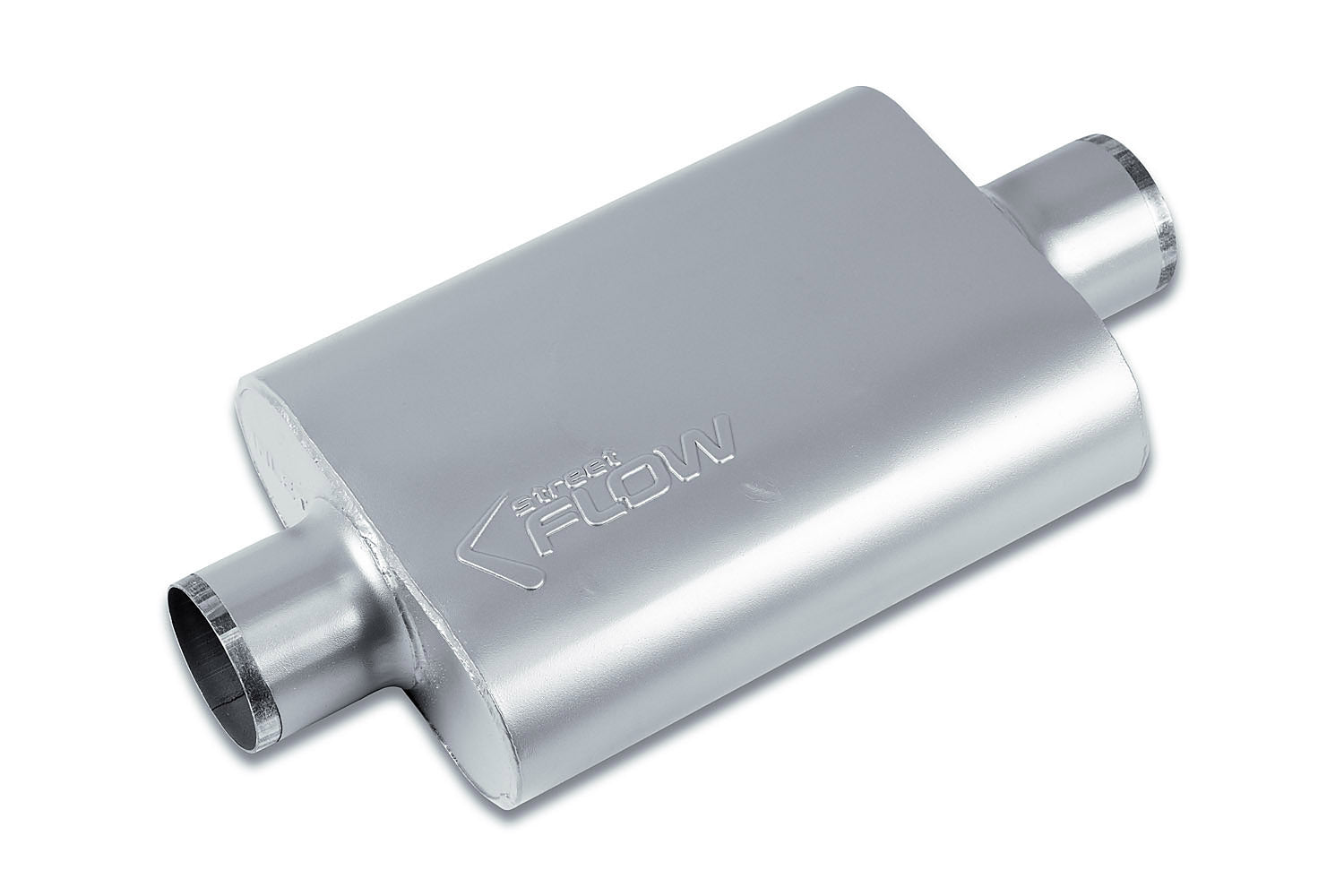 Street Flow, 2 Chamber Performance Muffler, Aggressive to Moderate Tone, 16-Gauge Aluminized Steel, Premium Powder Coat Finish, 3.0" Center In, 3.0" Center Out, 3 Year Limited Warranty.