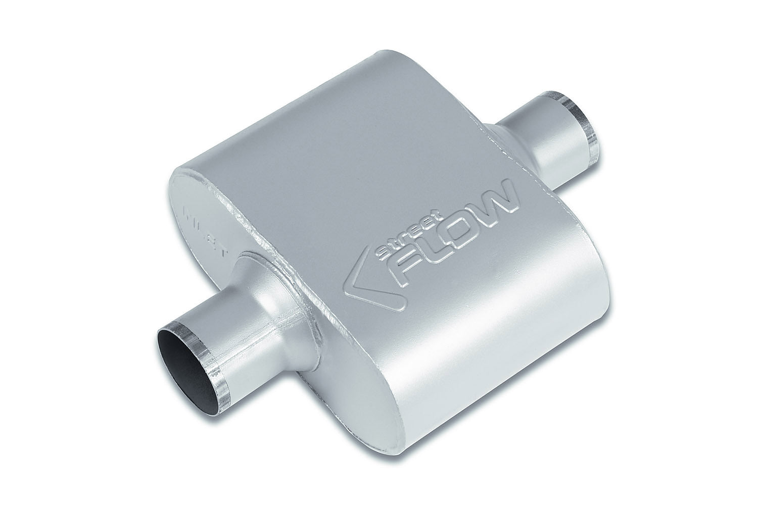 Street Flow, 1 Chamber Performance Muffler, Aggressive Tone, 16-Gauge Aluminized Steel, Premium Powder Coat Finish, 2.25" Center In, 2.25" Center Out, 3 Year Limited Warranty.