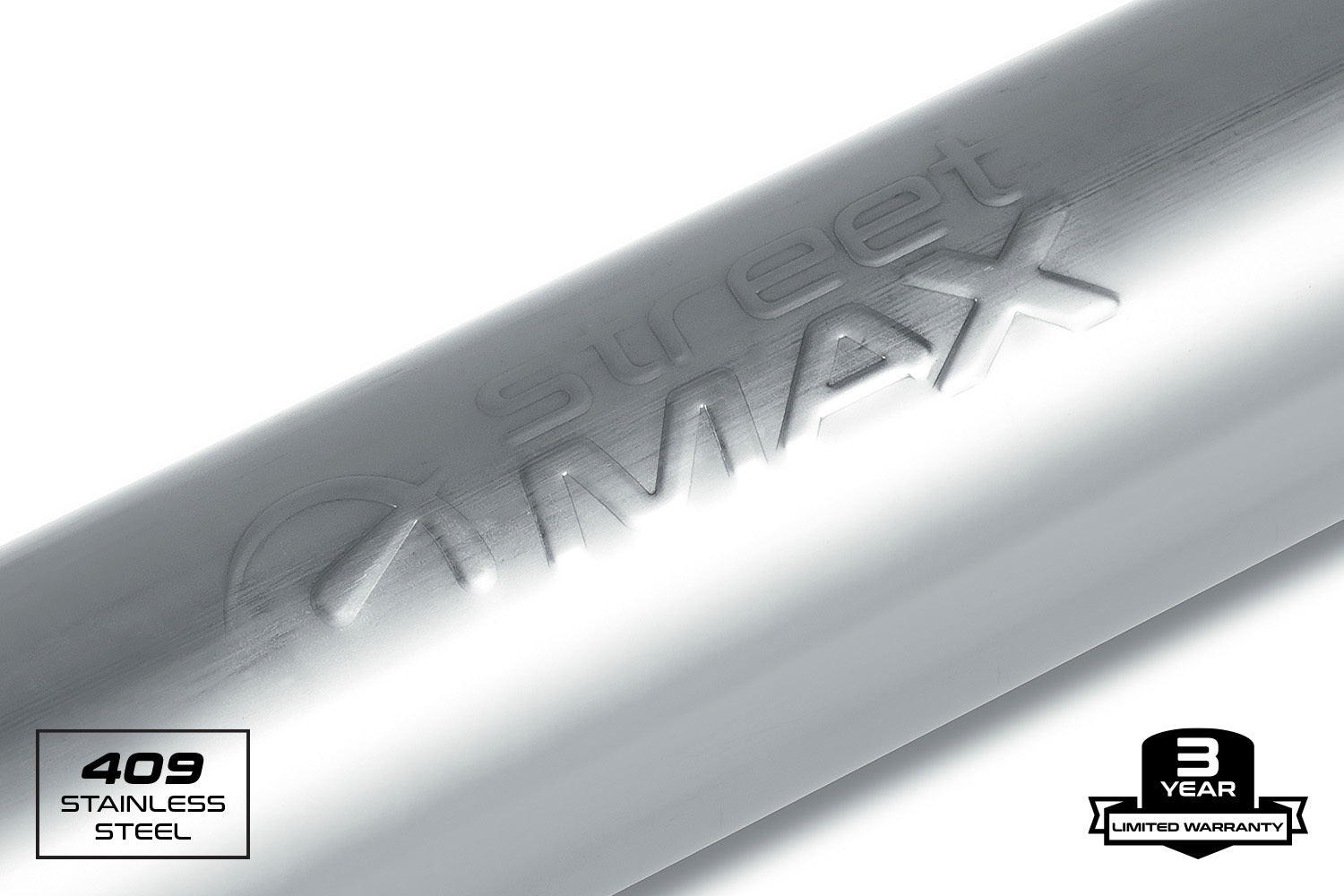 Street Max, Stainless Straight-Through Performance Muffler, 4.0" x 18.0" Round Body, Aggressive to Moderate Tone, 16-Gauge 409-Grade Stainless Steel, Satin Finish, 2.25" Center In, 2.25" Center Out, Reversible, 3 Year Limited Warranty.