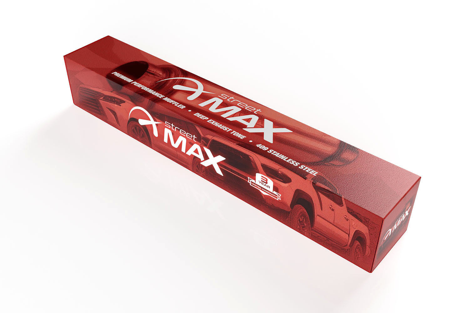 Street Max, Stainless Straight-Through Performance Muffler, 4.0" x 22.0" Round Body, Mild Tone, 16-Gauge 409-Grade Stainless Steel, Satin Finish, 2.25" Center In, 2.25" Center Out, Reversible, 3 Year Limited Warranty.