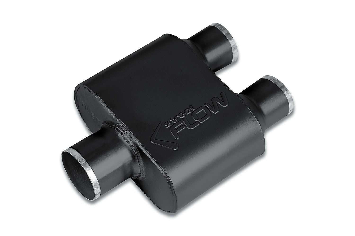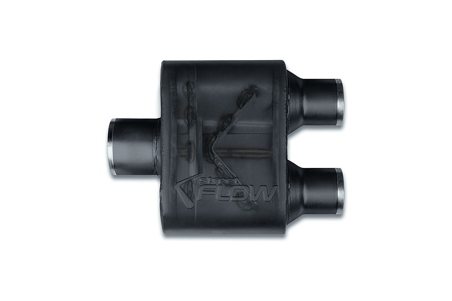 Street Flow Stainless, 1 Chamber Performance Muffler, Aggressive Tone, 16-Gauge 409-Grade Stainless Steel, Premium Powder Coat Finish, 3.0" Center In, 2.5" Dual Out, 5 Year Limited Warranty.