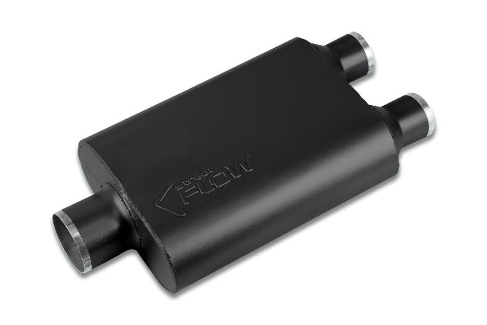 Street Flow Stainless, 2 Chamber Performance Muffler, Aggressive to Moderate Tone, 16-Gauge 409-Grade Stainless Steel, Premium Powder Coat Finish, 3.0" Center, 2.5" Dual Out, 5 Year Limited Warranty.