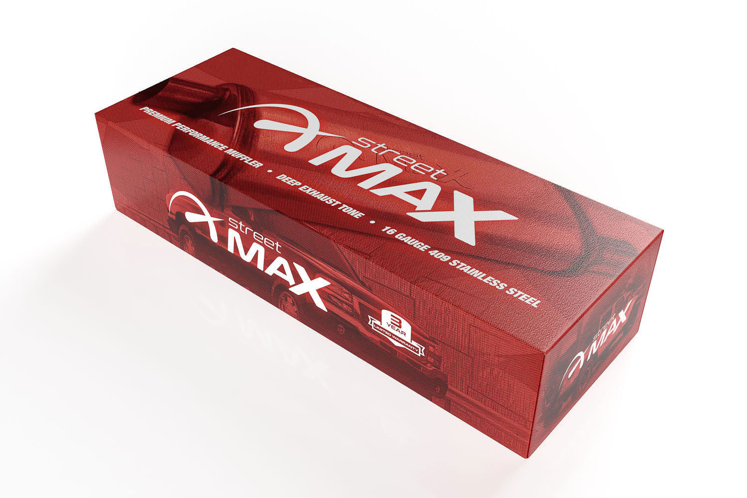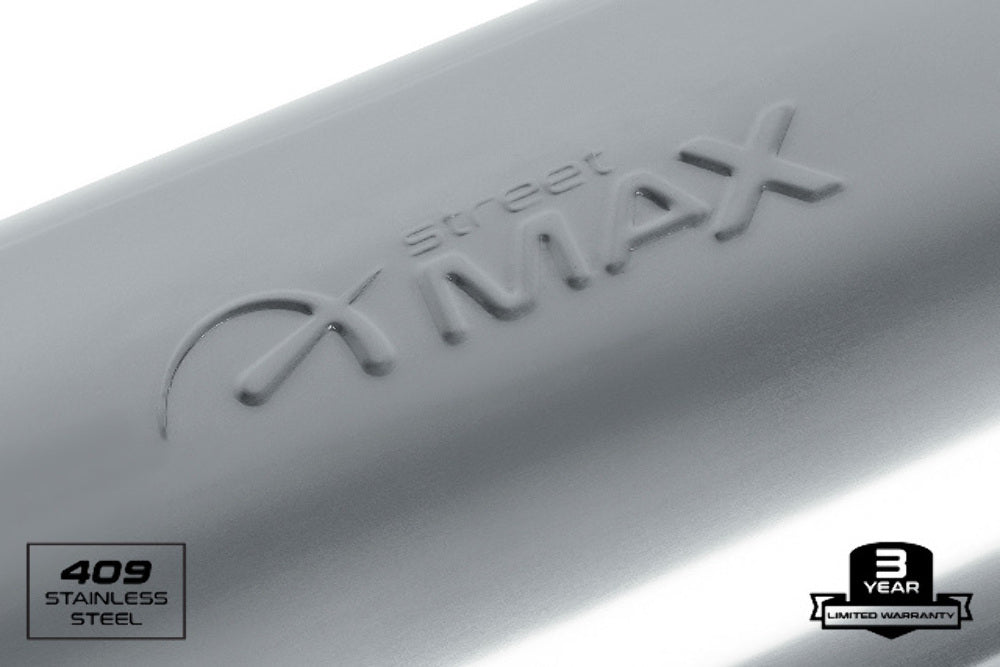 Street Max, Stainless Straight-Through Performance Muffler, 5.0" x 8.0" x 18.0" Oval Body, Moderate Tone, 16-Gauge 409-Grade Stainless Steel, Satin Finish, 2.25" Offset In, 2.25" Center Out, Reversible, 3 Year Limited Warranty.