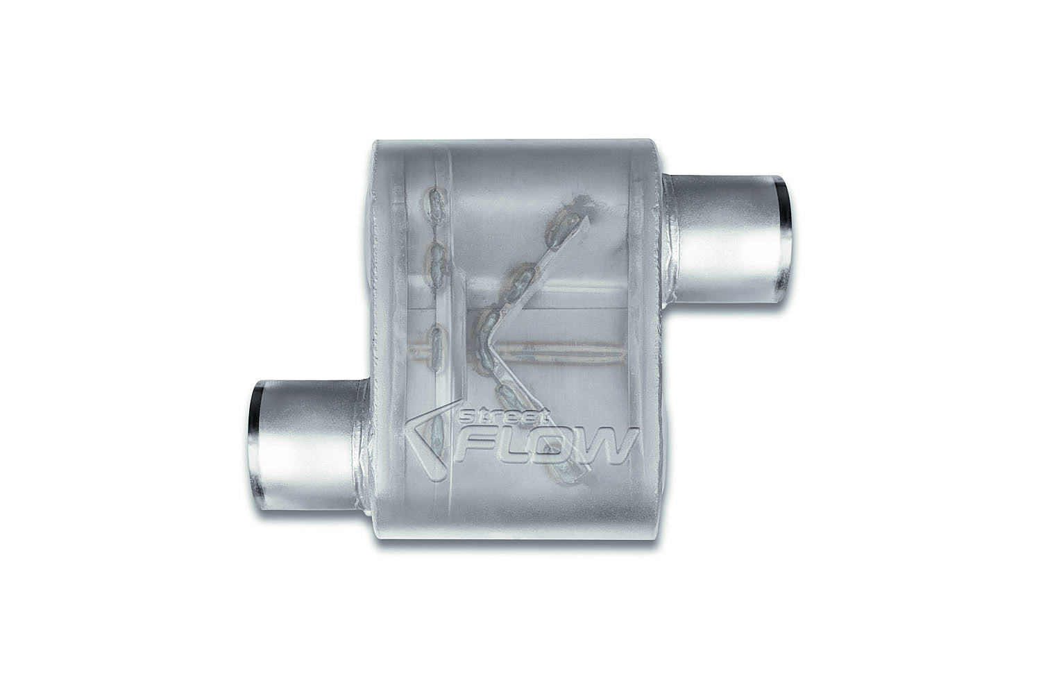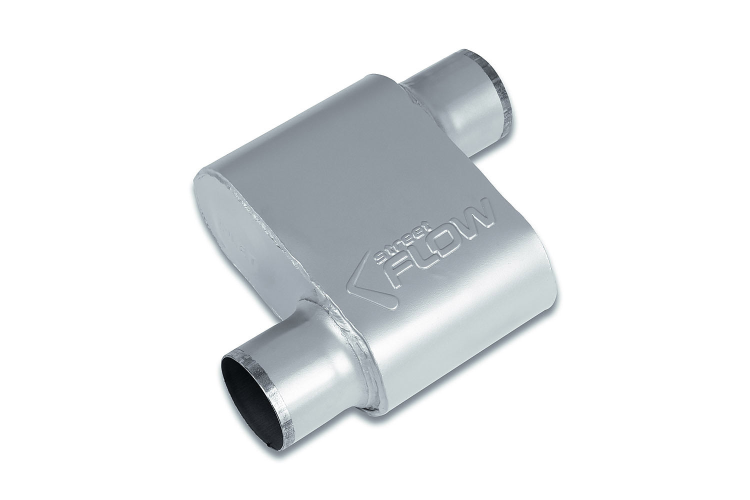 Street Flow, 1 Chamber Performance Muffler, Aggressive Tone, 16-Gauge Aluminized Steel, Premium Powder Coat Finish, 3.0" Offset In, 3.0" Offset Out, 3 Year Limited Warranty.
