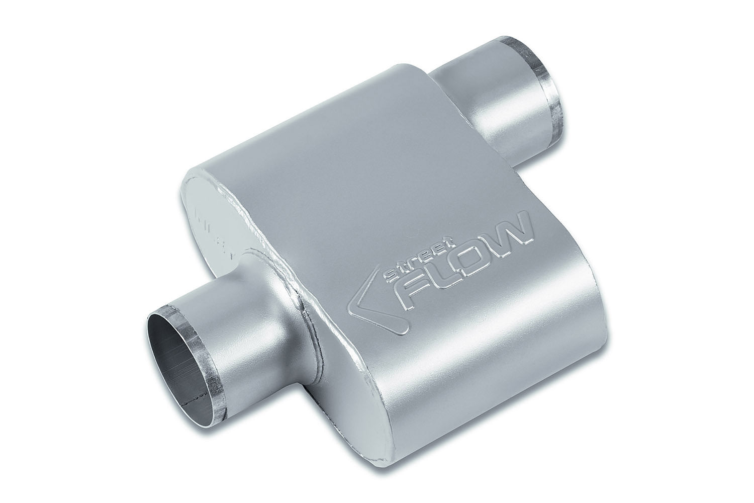 Street Flow, 1 Chamber Performance Muffler, Aggressive Tone, 16-Gauge Aluminized Steel, Premium Powder Coat Finish, 3.0" Center In, 3.0" Offset Out, 3 Year Limited Warranty.
